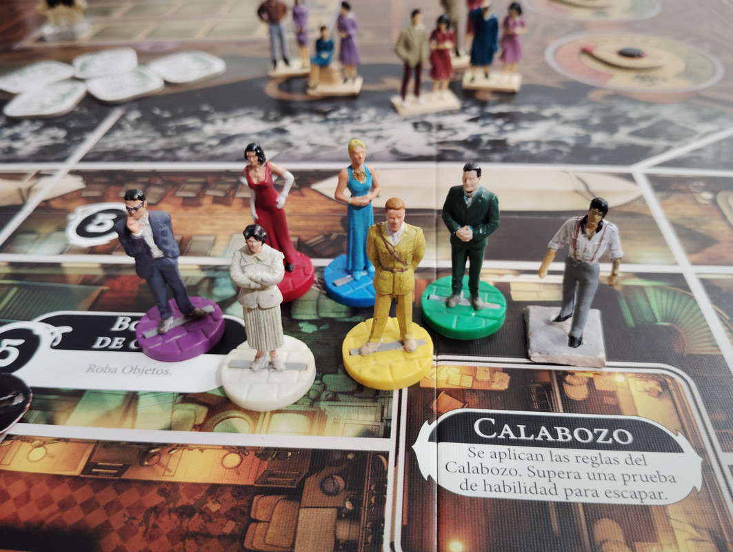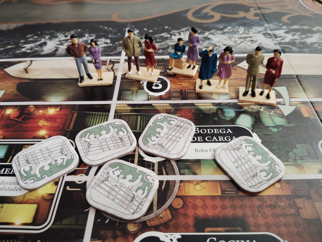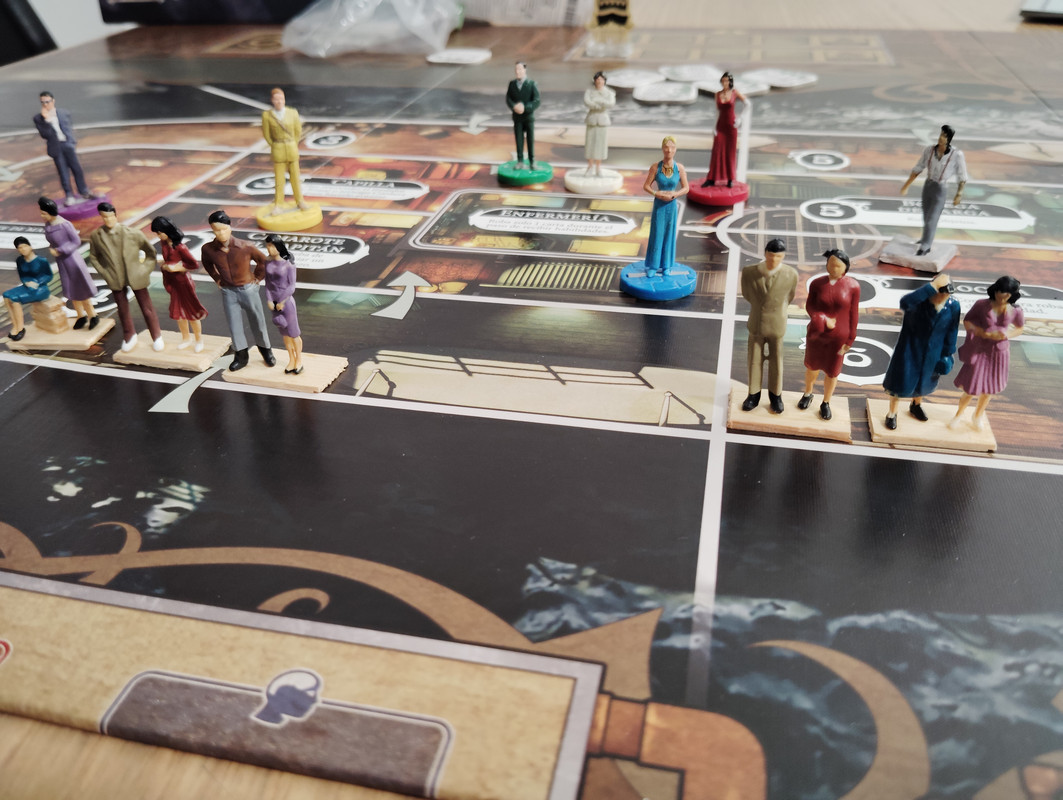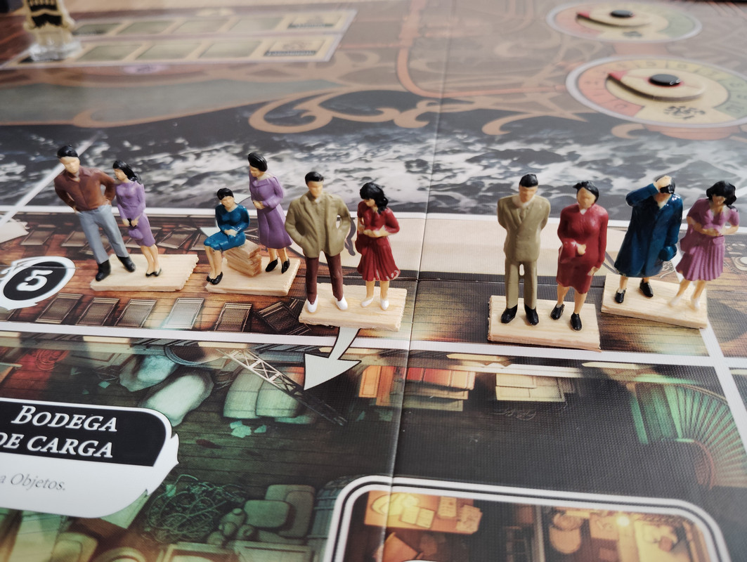 InsondableEn este juego hay unas fichas de pasajeros, que he sustituido por unas figuras de maquetas que compré iban pintadas de aquella manera les he dado un pequeñito repaso y las he pegado en trocitos de madera . Los personajes son de un Cluedo que también uso en el Horrified. Estás son las fichas originales de pasajeros.  Las fichas originales más las figuras que pillé.   Las figuras del Cluedo para los personajes.