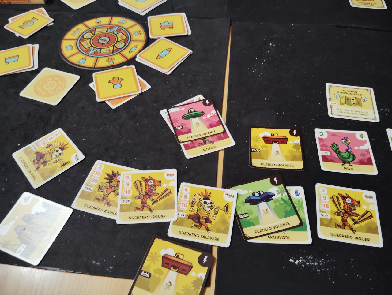 Creía que había subido mi último mensaje del miércoles pasado pero no lo subí, bueno al final fuimos tres jugadores con un intento de Nexus Ops hubo un error grave en la partida en el que los tres no nos dimos cuenta y habían entrado humanos a una zona de lava, como no sabíamos cómo volver esto atrás y se modificaba bastante la partida pues al final se anuló. Jugamos también un Ice Flow.. un juego que consiste en cruzar el estrecho de Bering y un Snow Time, buenísimo como siempre y también jugamos por último un juego un poco extraño llamado Aztecas VS Alienígenas , fue divertido.