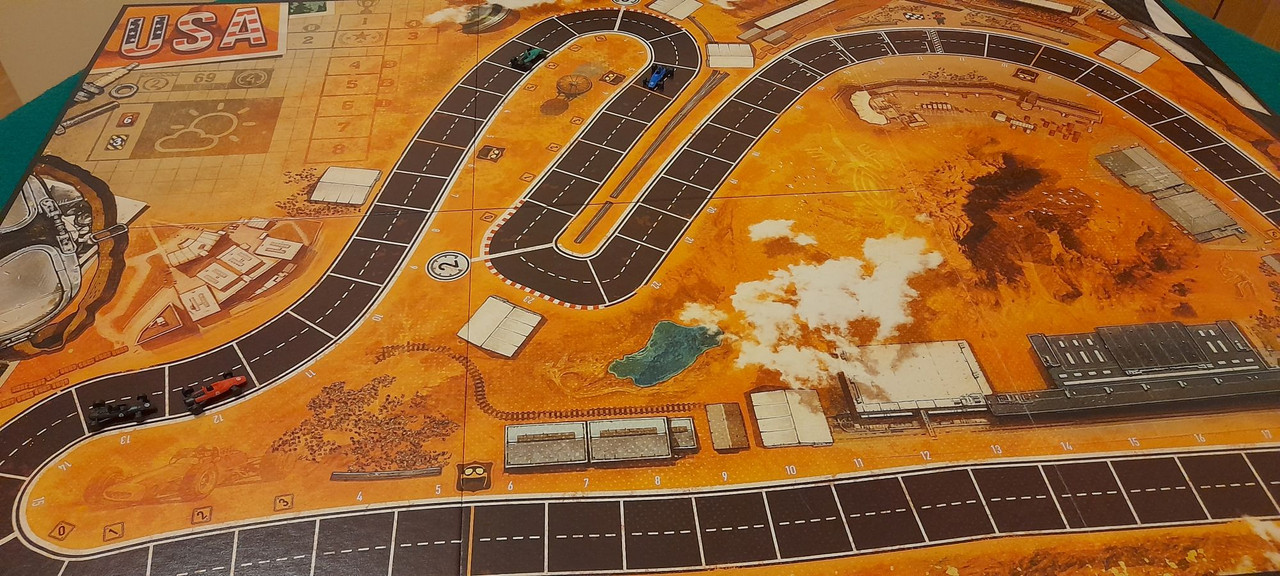 https://boardgamegeek.com/boardgame/366013/heat-pedal-to-the-metal Ya vale de tantas novedades. Parecemos del culto de lo nuevo, además de la secta del solitario Vuelvo a juegos ya consolidados. Aunque Heat es de hace 3 años (y para mi eso es novedad) en los tiempos que corren ya es pasado pretérito. Recuerdo el gran revuelo que se armó, con conjuntas de nuevos circuitos y competiciones de solitarios. En mi caso es compra reciente y primera partida.Las reglas se leen bien y están bien ordenadas. No se si es necesario sacar dos librillos con reglas básicas y módulos, pero no está mal. Jugué con las normas básicas para un primer acercamiento y porque no me acordaba de los módulos, la verdad. Sólo añadí el de las “leyendas” que es el solitario, lógicamente. “Las calidades” son muy muy buenas, lo que es normal en un Days of Wonders. El juego ya está muy comentado por todas partes, pero básicamente es de gestión de mazo. No es necesariamente un push your luck, pero si quieres ganar (y pasarlo bien de paso) tienes que jugartela en las curvas, no vale con ir a lo tranquilo. Respecto a la partida. Usé el circuito USA; elegí el coche rojo para mí y otros tres “leyendas” por miedo a que se me hiciera largo con todos los coches, pero la verdad es que los bots se llevan muy fácilmente y se pueden meter todos sin problemas. Empecé muy seguro subiendo una marchita y jugando un par de cartitas yo muy tranquilo. Pués ya en el primer turno “las leyendas” me metieron unas diez casillas de ventaja. Rápidamente te das cuenta que si no quieres hacer el ridículo hay que ir a por todas desde el primer momento. En las siguientes curvas ya empecé a quemar motor para ir arañando alguna casilla. Creo que el secreto es irse posicionando correctamente para tomar las curvas y no perder turnos extra. En este sentido me da la sensación de una carrera de verdad, arriesgando pero midiendo al milímetro porque, como pierdas un turno por no colocarte bien ya vas a remolque toda la partida. Es muy curioso el movimiento de los bots que hace que alguno se vaya quedando rezagado y otros se escapen. En mi caso, el negro no tomó bien una curva y tardó un par de turnos en salir, lo que me dio la oportunidad de recuperarle e ir a su lado las dos vueltas. En la última me arriesgué y le adelanté a mitad de camino. Esto no es siempre adecuado, ya que el último tiene ciertas ventajas. Es preferible ir último a una casilla del penúltimo que adelantarle sólo una casilla. Por eso no usé nunca el rebufo para adelantar. En la última curva de 2 el coche negro volvió a quedarse a una casilla de pasar la curva, por lo que tendría otro turno lento. En ese momento aproveché para quemar todo lo que me quedaba de motor y sacarle cierta ventaja final. El azul y el verde ya habían llegado a la meta hace tiempo, yo luchaba por no quedar último. Tenía ya la mano llena de heats y sólo con doses y treses. La cosa es que pasé la meta en mi último movimiento con 3 o 4 casillas extras. El coche negro necesitaba más de 13 para adelantarme, por lo que tenía oportunidades de ganarle. De repente, miro la carta de bots y le toca avanzar 15 casillas … lo que significa que pasó el primero Me sentí un poco Fernando Alonso … El solitario está muy bien y se disfruta mucho. Aún así, mi opinión es que en este juego la gracia está en jugar con humanos; que metan la pata de vez en cuando y poder hacer un “in your face” durante un adelantamiento. Sólo para solitario creo que me cansaría en pocas partidas. Aquí una foto de cuando iba por delante del coche negro. Fui así casi toda la segunda vuelta, menos en el sprint final. En fin seguramente es culpa de los ingenieros y de las decisiones de equipo, jeje. ![]() 4