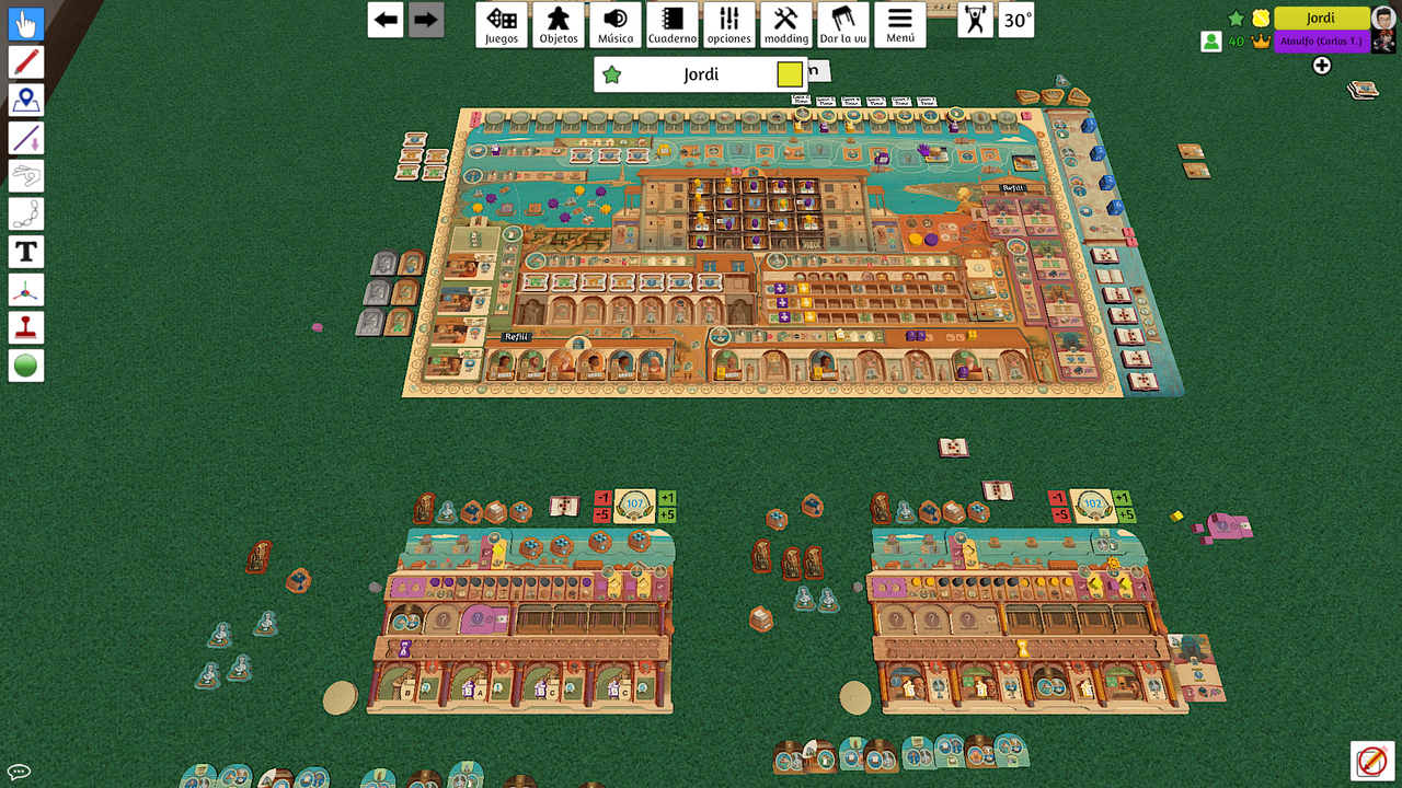 Ayer jugué por TTS a The Great Library con el amarillo, mi primera partida frente a la tercera del morado La nueva propuesta de Lacerda que actualmente esta en KS para salir el año que viene. Tematizado en la biblioteca de Alejandría, intentamos contribuir aportando la mayor cantidad de conocimiento, entrenando escribas para traducir documentos, obteniendo reliquias de navegantes o creando grandes obras, con la ayuda de grandes pensadores del momento y siempre cumpliendo las demandas del Rey y el gestor del archivo, gestionando el tiempo que necesitamos durante distintas generaciones hasta que el edificio sea destruido Es un juego entretenido sin más, hay básicamente el barco para hacer coger recursos, reliquias para la liberaría, piedras para las grandes obras o activar otros lugares; por otro lado puedes traducir obras gastando tiempo de los escribas que has entrenado también con tu tiempo, siendo un proceso casi siempre en 2 pasos pero que puntualmente puedes usar alguno sin haberlo llevado a la escuela, traducir es una fuente de puntos por si misma; y el otro es para subir casillas en varios registros por color (arte, leyes y medicina), tantos espacios como bustos y tiempo gastes con algunas limitaciones de saltos, obligando a activar el sitio varias veces para obtener grandes obras; estas 3 fuentes de losetas son para ponerlas en la biblioteca según cartas de contrato ganando puntos. Digo que activas distintos lugares y no acciones porque recuerda a White Castle en que a veces tienes que dar alguna vuelta para llegar a donde quieres, esos lugares se activan mediante losetas que consigues construyendo barcos o reclutando pensadores, en unan colocación de trabajadores que planificas en cada fase de ingresos de tiempo al final de ronda, que provoca un movimiento de fichas que puede detonar el final de partida parecido al Barcelona y en unos dados que se agotan para ganar el tiempo marcado o pagas el tiempo para activar el lugar designado, pocas veces me gustan los dados pero aquí creo que ha encontrado un buen equilibrio entre el azar y las decisiones muy bien llevado. De inicio da sensación que va a terminar la partida rápido sin poder hacer mucha cosa pero tras los primeros ingresos ya coges algún pensador que permite buscar como llegar a sitios y acabas desbloqueando gran parte del tablero personal y prácticamente llenando la cuadrícula de la biblioteca, que es la otra manera de detonar el final de partida. En conclusión, te deja decidir por cual de las 3 vías vas a poner losetas de manera eficiente salvando a los oponentes, es solido y esta bien hecho, en la media de sus juegos