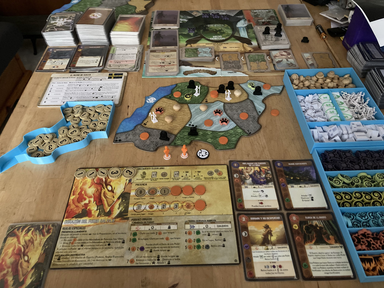 Durante esta semana he hecho una campaña de 6 niveles contra los suecos en Spirit Island, con el espíritu "Corazón de fuego salvaje" de el promo pack 1 del ks (luego en la expa Feather & flame) de dificultad alta El personaje utiliza una estrategia muy agresiva de hacer daño poniendo presencia a costa de meter plaga, y encima hacer más daño por fuego donde tenga presencia + plaga, luego puede devolver esa plaga a la carta de isla con otro poder, sistema arriesgado porque es muy fácil pasar a isla infectada, con la posibilidad de perder la partida en un descuido, sobretodo ceder alguna plaga en un saqueo mal calculado o por algún evento No tuve complicaciones hasta el 5 nivel, solía terminar en 4 o 5 turnos quemando a los invasores antes de que pudieran hacer nada, pero con los añadidos de dificultad, cada vez había más enemigos iniciales alargando la partida. Este espíritu sufre cuando las fichas de plaga restantes escasean, impidiendo poner presencia y hacer daño, tienes que hacer turnos de recuperar cartas (que acabas jugando bastantes) y aguantar el chaparrón recuperando plaga para pegar fuerte en el siguiente crecimiento, también acaba escaseando la energía al provenir también del crecimiento por presencia, aunque en alguna partida larga puedes acabar picando un poder mayor si recuperas plaga por turno. Pude ganar todas las partidas, en las 2 últimas llegué al paso de invasores y nivel de miedo 3, con algún evento en mi contra dudé de conseguirlo pero el bicho hace tanto daño que acabé limpiando la isla. Dejo foto de la victoria final