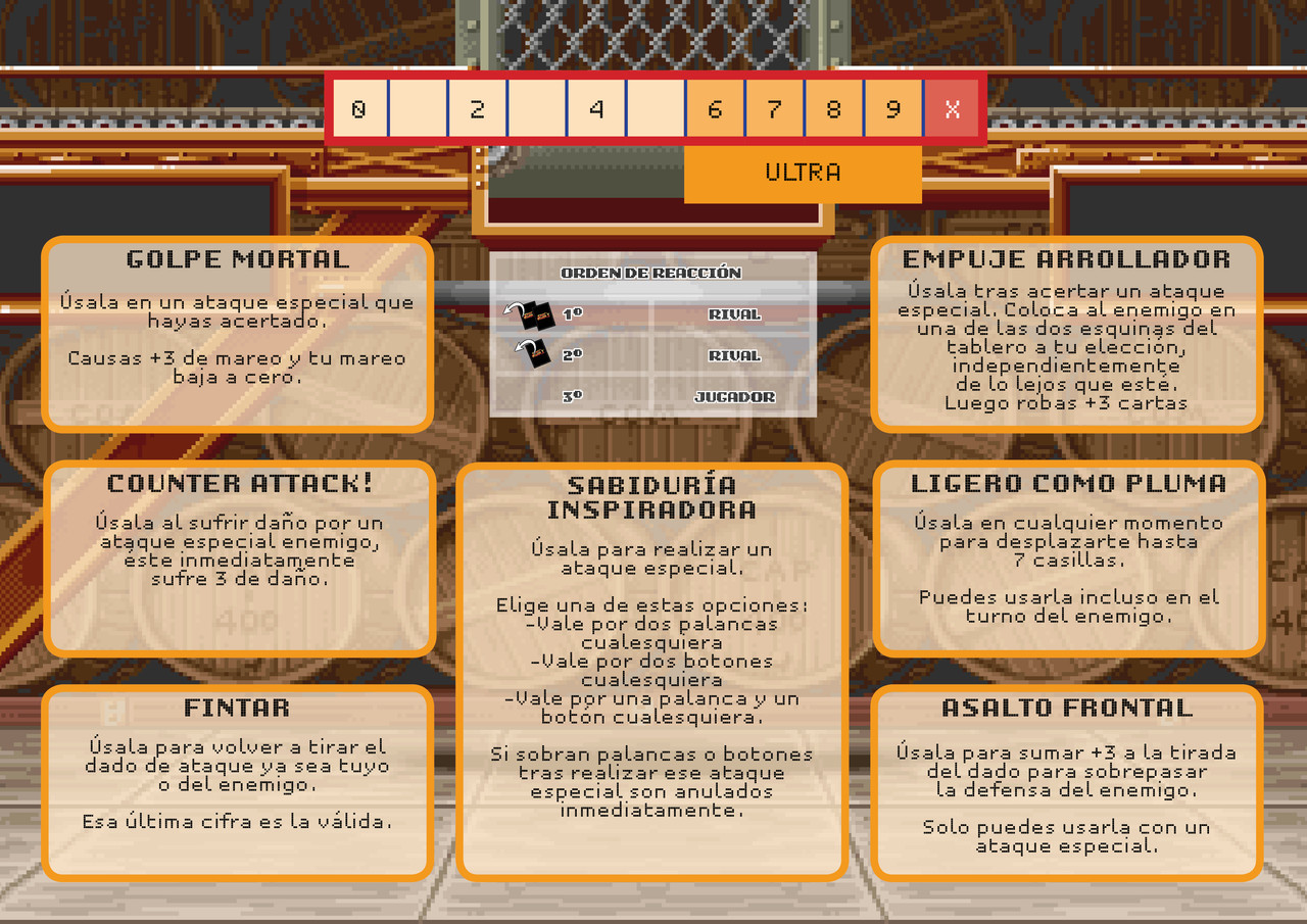 Talleres / Re:Creado por Bellmanz y Krs666: "Street Fighter 2"« Último mensaje por Bellmanz en 05 de Abril de 2026, 12:39:20 »![]() Avance: Pues el gran Krs666 ya ha hecho la plantilla, o minitablero, para el modo solitario. En él se puede ver la barra de "Ultra" y resaltado en naranja cuando tienes opción de usar uno de ellos y en rojo cuando llegas al 10 y se ta pasa el arroz, o sea, que ya no puedes usarlos y vuelves al cero. Ya expliqué en un comentario del post anterior como funcionaban y que la anterior regla de "Cheats" ya estaba eliminada del juego. En recuadros naranjas claro están todos los ultras disponibles. Cuando llegue tu contador al 6 ya podrás usar uno de ellos a tu elección, pero recuerda que si sigues jugando sin usarlo puede que llegues al 10 (X) y ya no podrás disponer de ellos hasta que no vuelvas a llegar al 6. Podrás hacer uso de ultra desde el contador 6 hasta el 9 ambos inclusives. Una vez que lo uses volverá el contador al cero, al igual que si llegas al 10(X) volverás al cero. El recuadro gris de enmedio, bajo la barra de Ultra, es el orden de iniciativa de la ronda de juego. En él se ve como los dos primeros turnos son del CPU y el tercer turno es del jugador, pero se indica que si al empezar una ronda descartas una carta juegas en el turno segundo y si descartas dos en lugar de una juegas en primer turno. O sea: --Descartas una carta al empezar la ronda: Turno 1 CPU- Turno 2 jugador- Turno 3 CPU --Descartas dos cartas al empezar la ronda: Turno 1 jugador- Turno 2 CPU- Turno 3 CPU El fondo de la plantilla es la de la fase de bonus de los barriles. Un detallazo por parte del genial Krs666. Ya os seguiré informando, gracias |