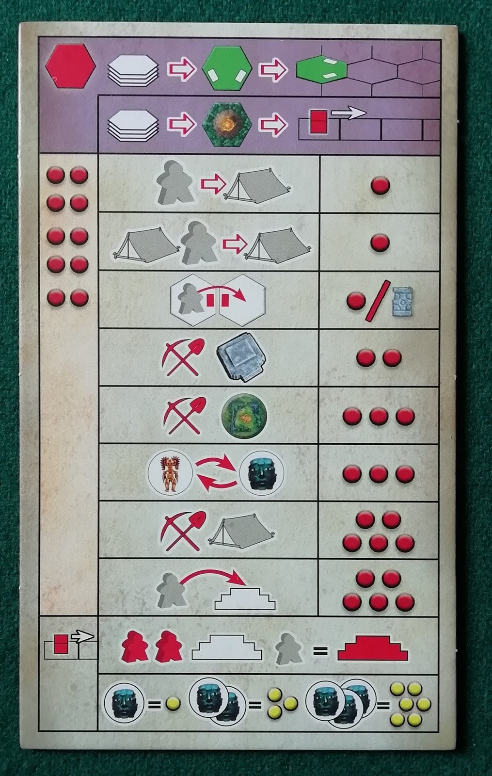 Después tendremos 10 puntos de acción para introducir a nuestros meeples en el tablero, moverlos por las losetas, recoger tesoros, descubrir templos y aumentarlos de nivel, colocar nuevas bases de exploración, robar tesoros a otros jugadores (muy divertido) o sacrificar meeples para quedarnos con un templo.
