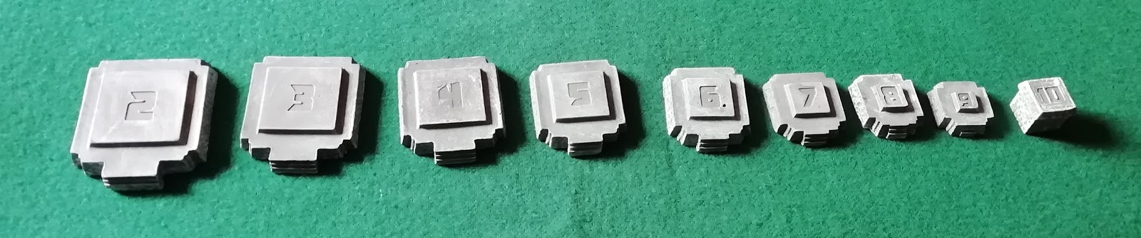 Y por último las piezas de los templos Mayas en resina. Una pasada, me encantan. Todas llevan un número encima, desde el 2 al 10, aunque como veis no hay el mismo número de cada una. Esto hace que solo una persona pueda hacer una torre de 10, por ejemplo.