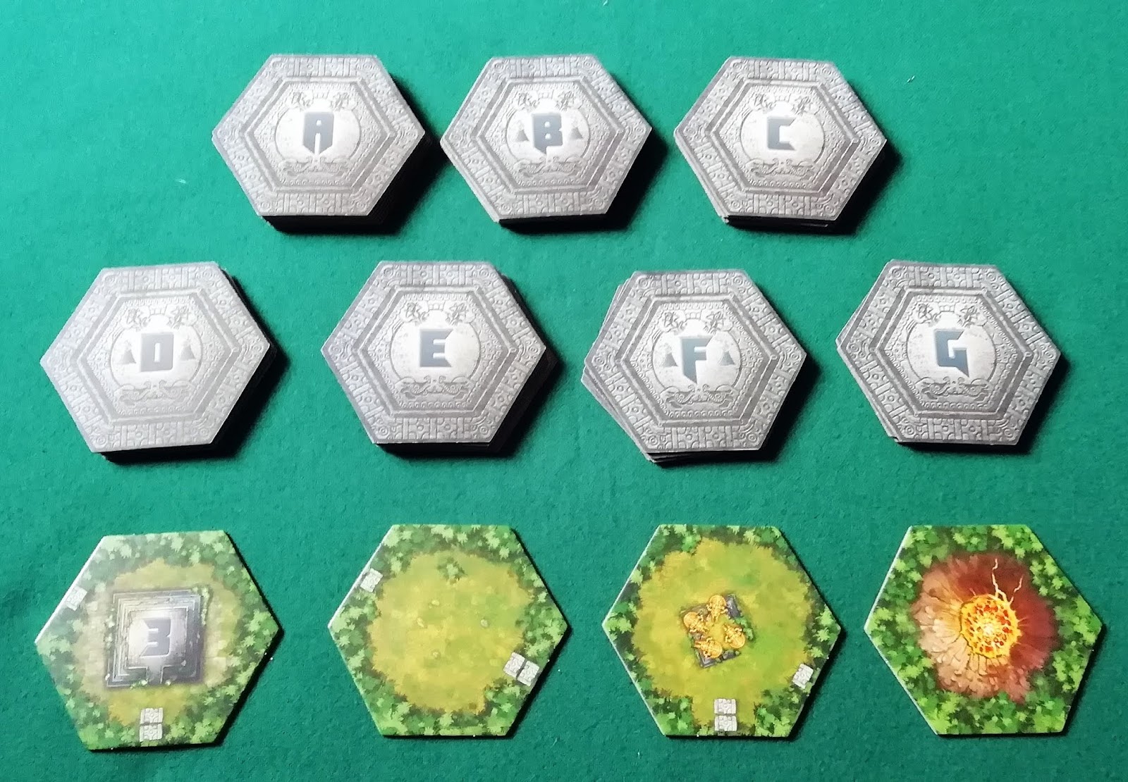 Tenemos también unas losetas hexagonales de bastante buena calidad. De estas hay cuatro tipos, las que tienen un templo, un claro, tesoros y volcán. Como veis el arte está muy cuidado.