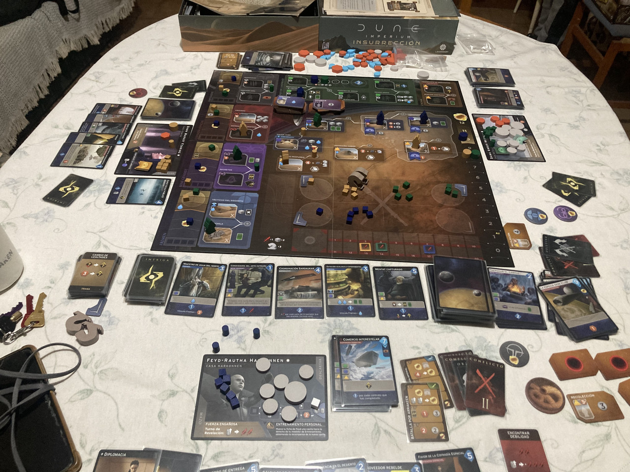 Busqué de inicio los Fremen para tener gusanos y romper la muralla aunque ellos también terminaron consiguiéndolos, todos pillamos también el 3 peón aunque yo fui el último, el verde nadaba en recursos utilizando la casilla de la Cofradía y logró sacarme el punto Fremen mientras yo compré una carta de la misma Cofradía que me daba 1 punto cada vez que la usaba por 4 especia, quitándole también su punto en esta facción, luego ya las batallas, se las repartieron ellos sin poder ganar yo ninguna en toda la partida, siempre tenían alguna carta de intriga escondida o habilidades al revelar la mano, la mitad de mis puntos fueron por la mencionada carta de la Cofradía