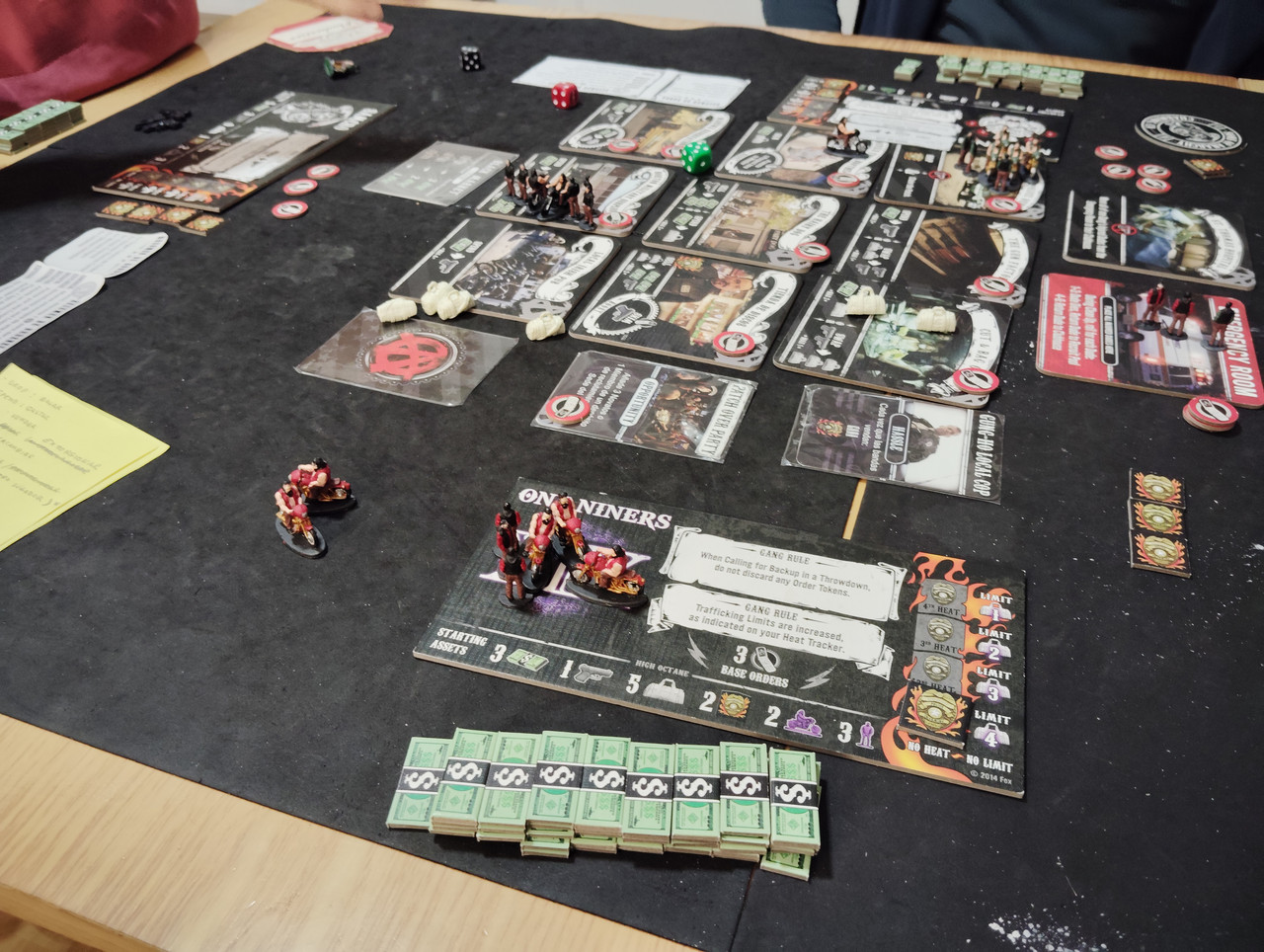 , es un juego que se me da bastante bien, modestia aparte, hace un par de miércoles gané con Sam Cro, y este volví a a ganar, eso sí, de una manera más ajustada con One Ninners XIX 41 dólares, Mayans 38 y Sam Cro 29... La verdad es que es un juego del que se oye poco hablar y está muy bien, con un setup rápido, bastante variación entre partidas; hay cinco losetas de localización fijas pero se eligen 6 losetas de localización diferentes al azar de 19 cada partida, y también se eligen 15 cartas al azar de 40 que es lo que va a marcar el tiempo de la partida, localizaciones extra, cambios de reglas durante el turno y los diferentes eventos. Con lo cual no hay dos partidas iguales.
