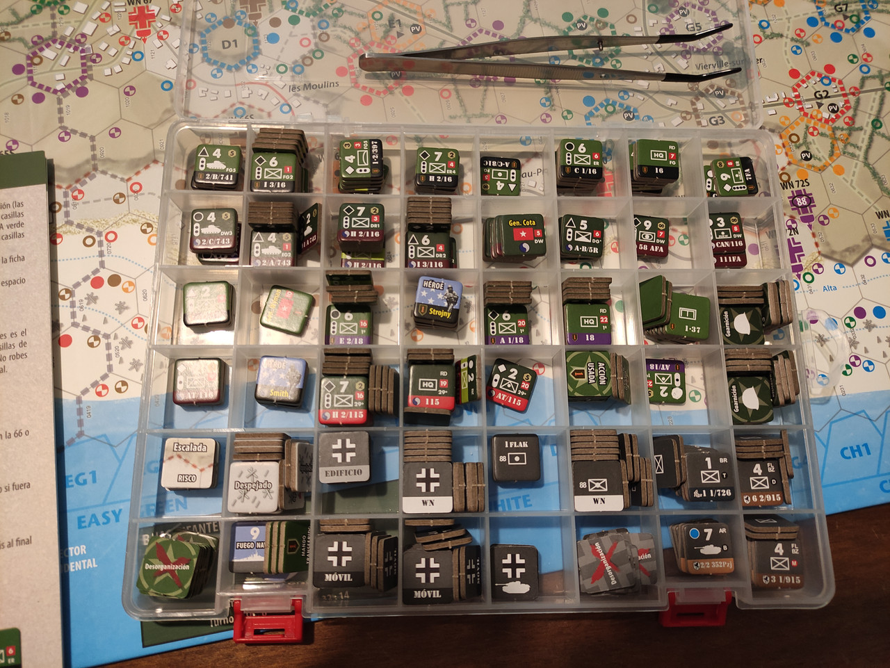 Así me he organizado yo las fichas del juego, con una caja de AliExpress de 48 espacios.