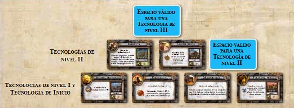 . Ahora puedes gastar los puntos de comercio que te queden en investigar una nueva tecnología. Se va formando una pirámide de tal manera que primero necesitas ciertas tecnologías de nivel 1 para alcanzar el nivel 2 y así sucesivamente. Si algún jugador llega al nivel 5, obtiene la victoria tecnológica.