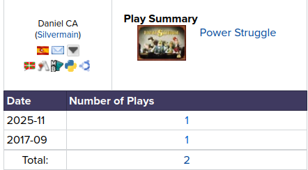 Pues ha aparecido un juego al que no puedo decir la cantidad exacta de tiempo que llevo sin jugar... resulta que la partida (o partidas) anterior son previas a que empezara a registrar las partidas en la BGG. Empecé a registrarlas en diciembre de 2004. En aquella época la 'central' empezaba a mudarse de Badajoz capital a Esparragalejo, y CSI Badajoz era solo una entelequia mental.