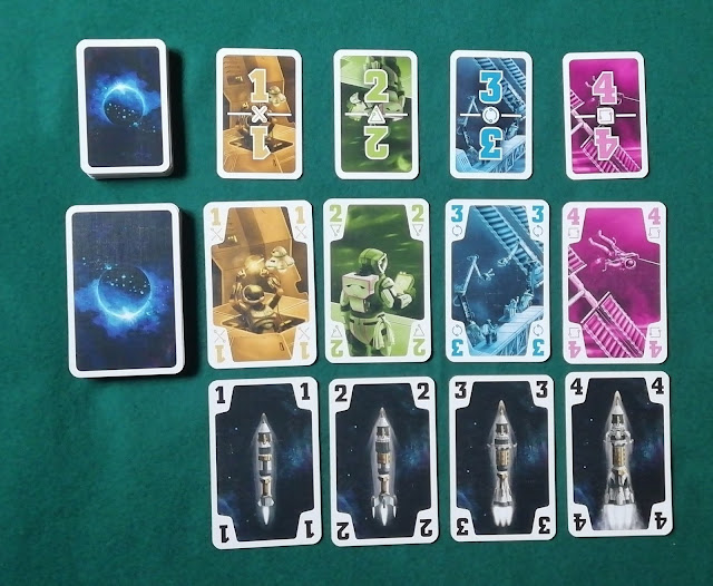 Hay cartas de 1 - 9 en cuatro colores y 4 cartas con un cohete, numeradas del 1 - 4