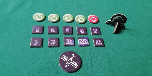 Con el juego viene una lámina de cartón para destroquelar con 5 fichas de comunicación (casco), una pieza montable en 3D para el jugador inicial (capitán), varias losetas numeradas y con símbolos y una ficha con una estación espacial.