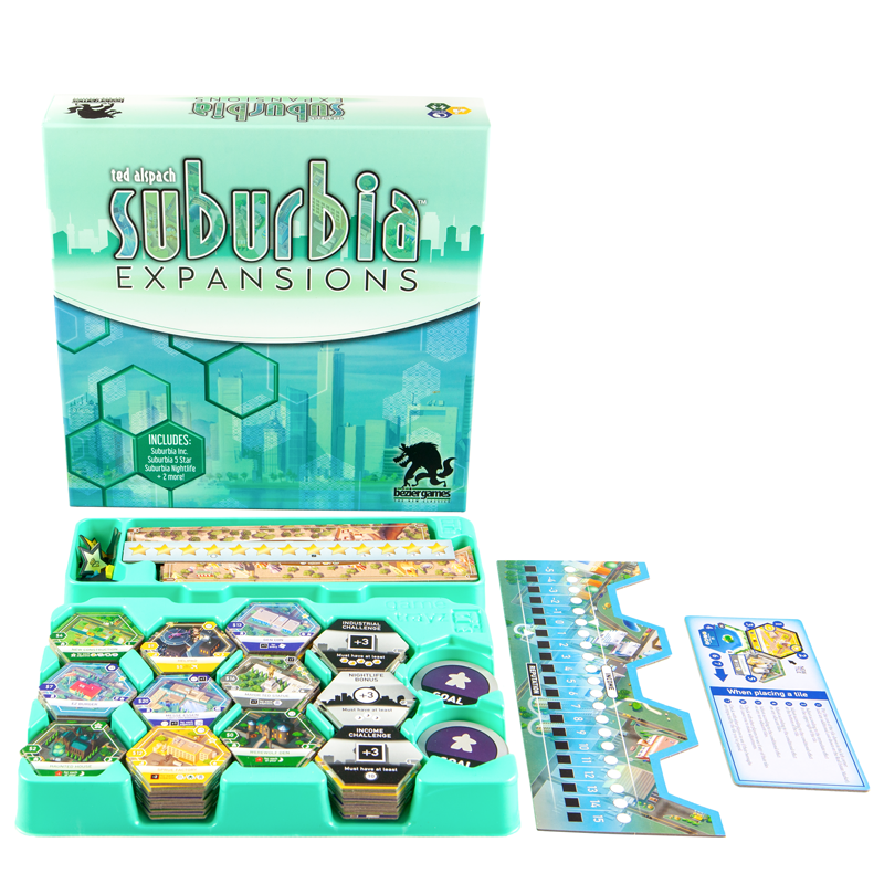 Suburbia Expansions contiene tres grandes expansiones para Suburbia que se publicaron originalmente de forma independiente -Suburbia Inc, Suburbia 5★ y Suburbia Nightlife-, así como dos expansiones más pequeñas: Essen y Cons. Estas expansiones pueden utilizarse con Suburbia de una en una, mezcladas o todas a la vez.