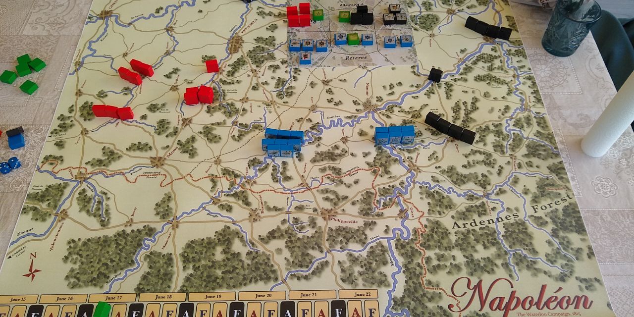 El sábado engañé a mis amigos no wargameros, que les gustan los juegos pero no juegan juegos de guerra, y aprovechando que éramos tres nos echamos un Napoléon: The Waterloo Campaign, 1815. Ellos no habían jugado nunca y mi explicación fue un poco reguleras. A pesar de ser 8 páginas de reglas tiene detallitos que siempre se me olvidan y alguna cosa hicimos mal como que las artillerías dispararon normalmente a sitios con unidades amigas implicadas cuando eso no está permitido. En nuestra partida los artilleros eran muy competentes, tenían muy buena puntería y no hubo fuego amigo