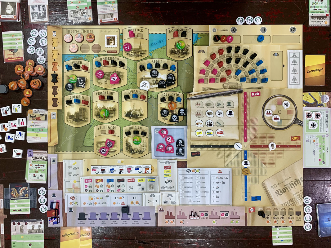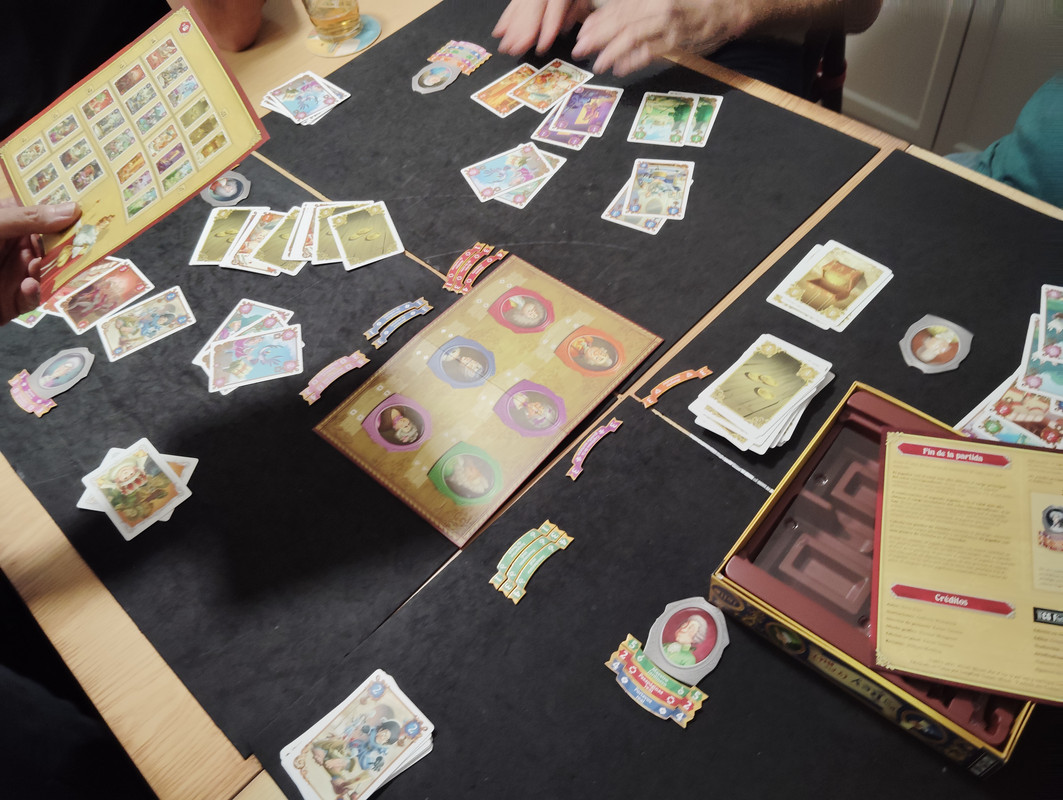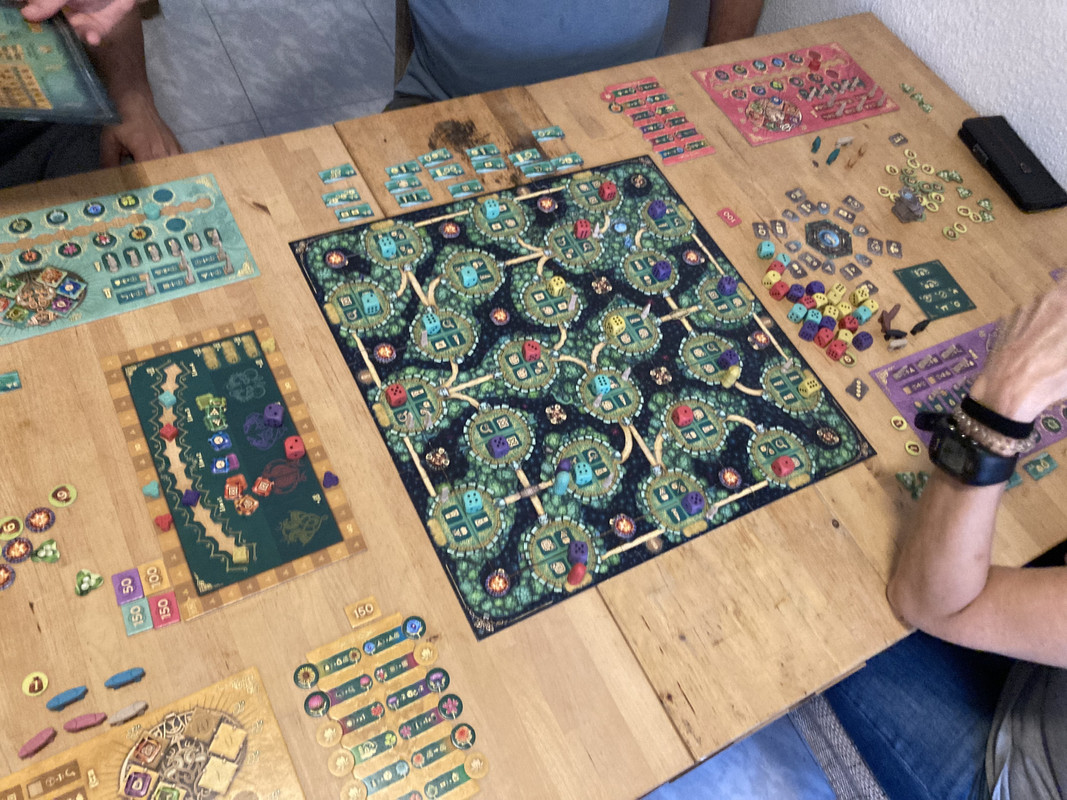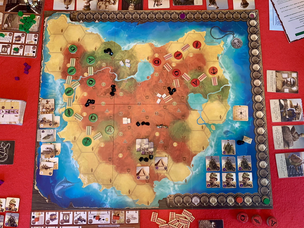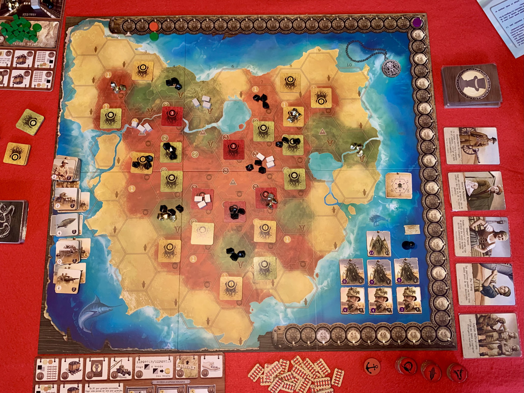 ... Spartacus.Es un juego que no conocía, y la verdad es que nos lo pasamos muy bien. Jugamos a 4, el máximo de jugadores permitido. Es un juego de mucho troleo, traiciones a doquier, y sangre, mucha sangre. Para obtener sirvientes, gladiadores y armas para que estos combatan se usa un sistema de subasta, al igual que para ser el anfitrión que organizará los combates en cada turno. Los dados para la lucha incluyen su parte de azar que permite que un gladiador inferior venza al campeón de la arena.