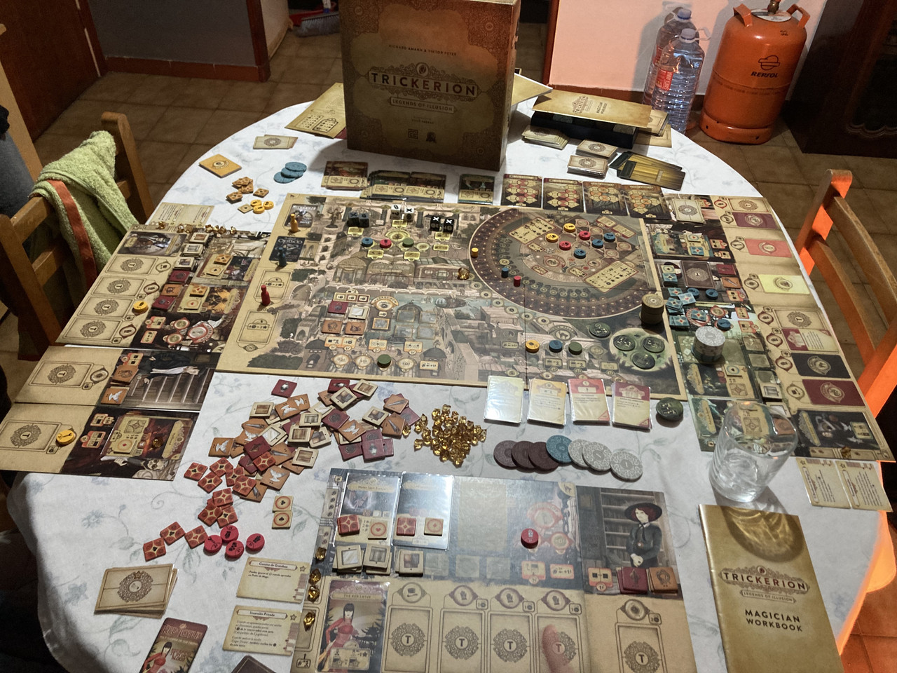 El lunes jugué a Trickerion con el azul, mi 7 partida frente a un novato y otro con varias también, añadimos la expansión Poderes de magos