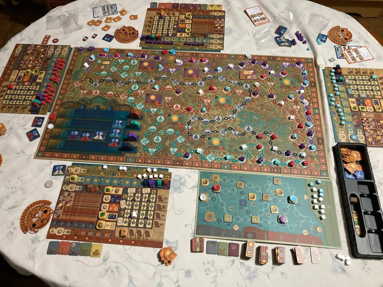 ... Pax Pamir, a cuatro.Fue una partida extraña, porque desde muy pronto tres jugadores apoyamos la facción afgana, por lo que el cuarto, que apoyaba al ruso, se quedó sin opciones de victoria, al no cambiar de facción al triunfar la segunda carta de dominancia. Nadie apoyo a los britanos, por lo que ningún ejército o camino rosa apareció por el tablero.La partida se decidió en el último tercio entre los tres "afganos", que nos dedicamos a conseguir obsequios y a destruir cartas de patriotas de otros jugadores.