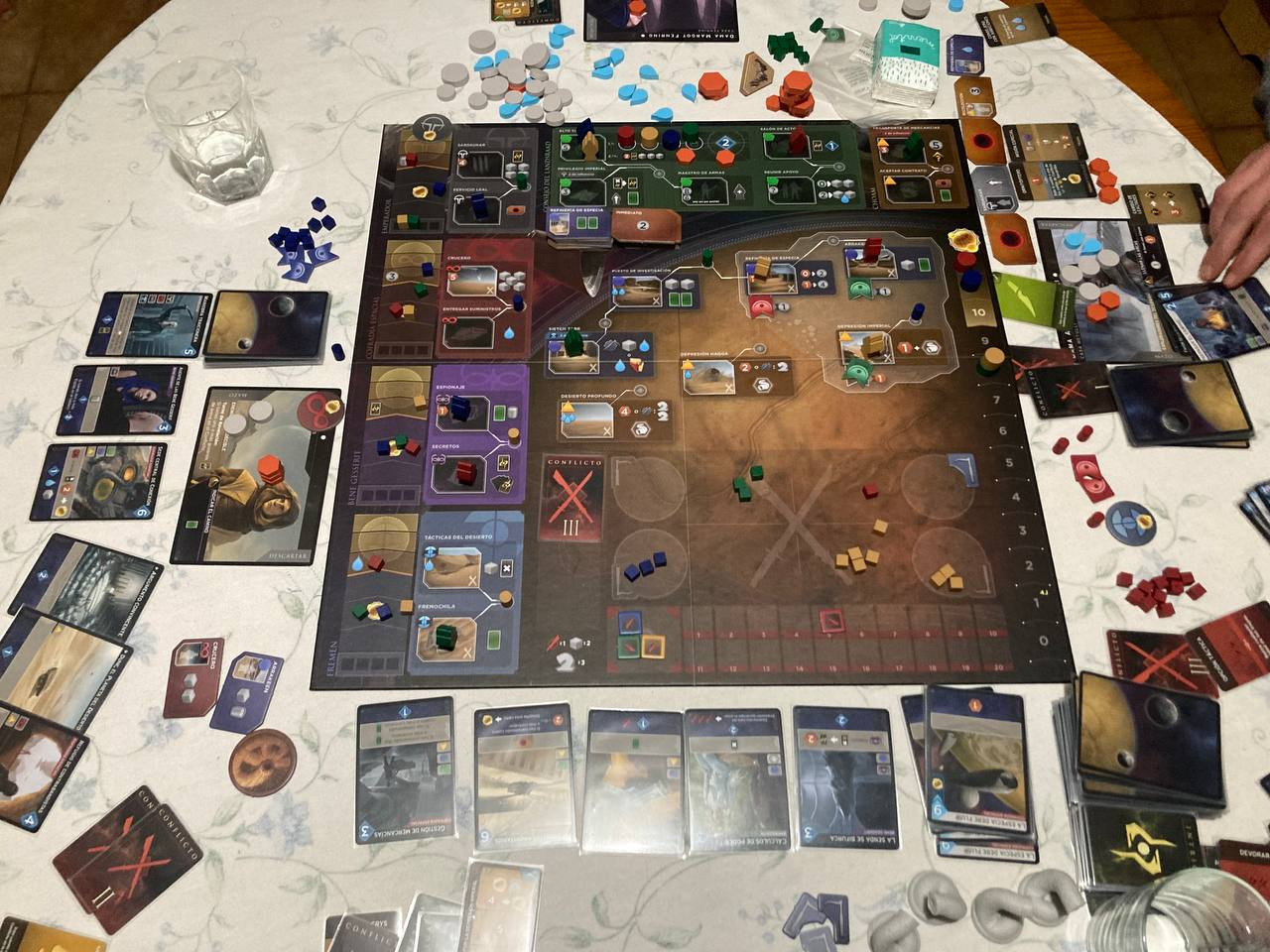 ... Pax Pamir, a cuatro.Fue una partida extraña, porque desde muy pronto tres jugadores apoyamos la facción afgana, por lo que el cuarto, que apoyaba al ruso, se quedó sin opciones de victoria, al no cambiar de facción al triunfar la segunda carta de dominancia. Nadie apoyo a los britanos, por lo que ningún ejército o camino rosa apareció por el tablero.La partida se decidió en el último tercio entre los tres "afganos", que nos dedicamos a conseguir obsequios y a destruir cartas de patriotas de otros jugadores.