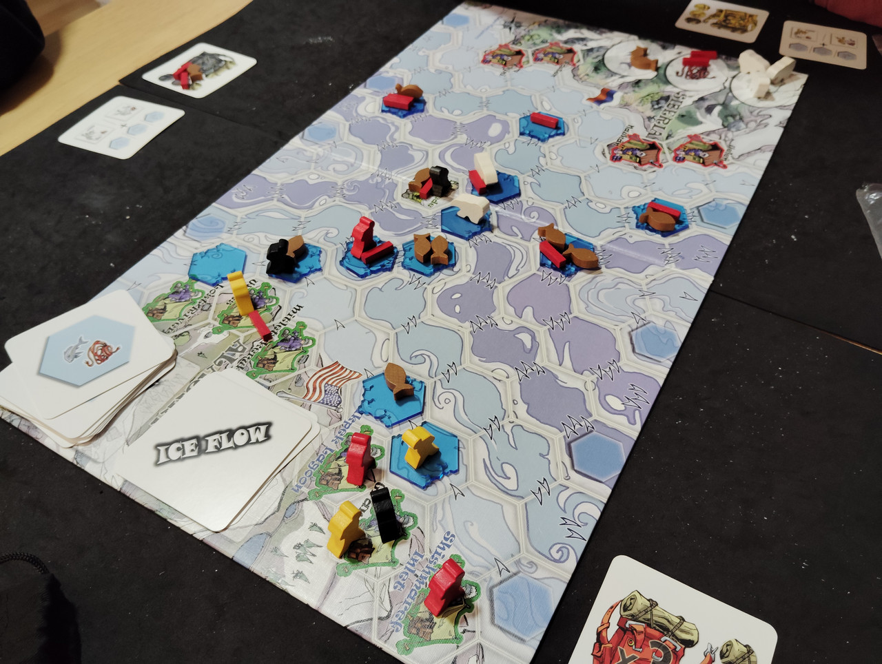 Usamos el mazo B, mi partida fue un desastre con las cartas mientras el rojo no paraba de bajar y combar cartones, me puse a plantar toda la partida con varios campos, azul de cabeza a meter bayas baratas con una carta y animales, me pase todo el rato sufriendo por comer, blanco tenía un combo de comida y bajó bastantes cartas pero no pudo desarrollar apenas su tablero, rojo y azul a media partida dejaron de pasar penumbras pudiendo procrear, azul pastaba de todo y rojo hizo menos plantas que yo y menos bichos que azul pero logro estar bien posicionado en todo
