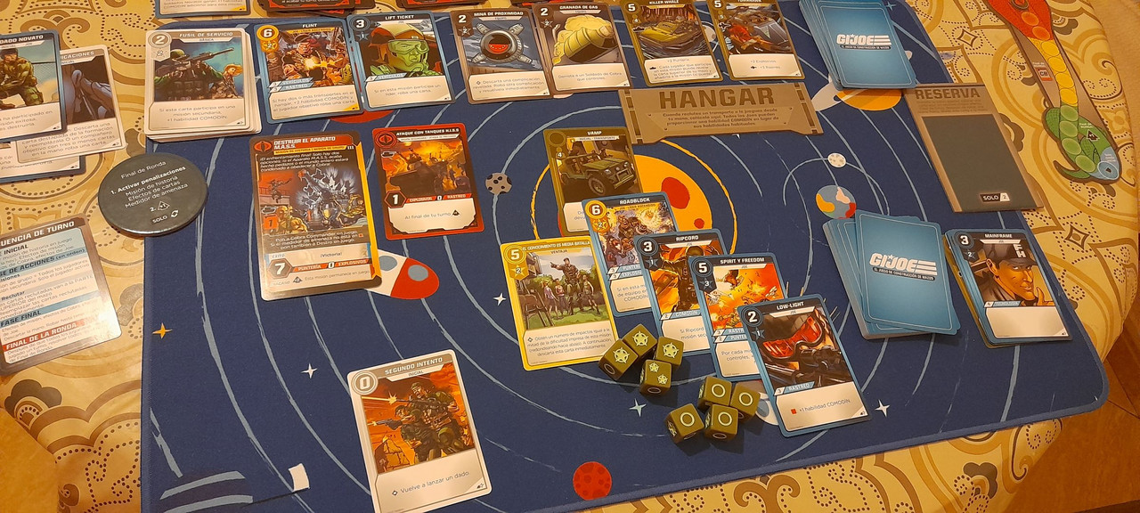 La última partida ya la jugué con las 9 misiones de la primera historia y perdí debido a que el medidor de cobra llegó al máximo justo en la última misión. Me lo jugué todo con un equipo de joes, que yo creía suficiente, pero los dados se quedaron cortos y ya no tenía cartas para modificarlos. En todo caso, final épico y mucho sufrimiento para eliminar al comandante cobra y demás ralea antes de poder acometer la misión propiamente dicha. Muy divertido y absorbente.