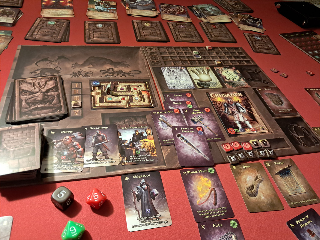 Es un juego de caja pequeña y que se puede jugar bien en solitario. En el fondo, es un push your luck, pero sin push. Es ir sacando cartas y ver que pasa (un see your luck). Tus decisiones, aunque parece que son varias, son siempre muy claras. Los malos cuando te hacen daño te obligan a desactivar o eliminar alguna carta. Eso es casi lo más tenso, el decidir cuál sacrificas.