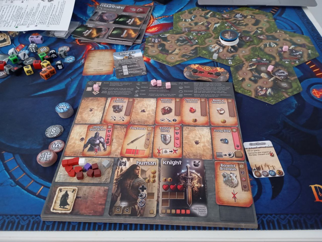 Al final ni dungeon crawler (que leyendo el manual está claro que no lo es) ni rellenar una ficha de personaje de D&D . Es un juego de optimizar y hacer cuentas sin parar. No jugué nunca al sagrada, que dicen que es similar, por lo que no puedo comparar si es más pesado o no.