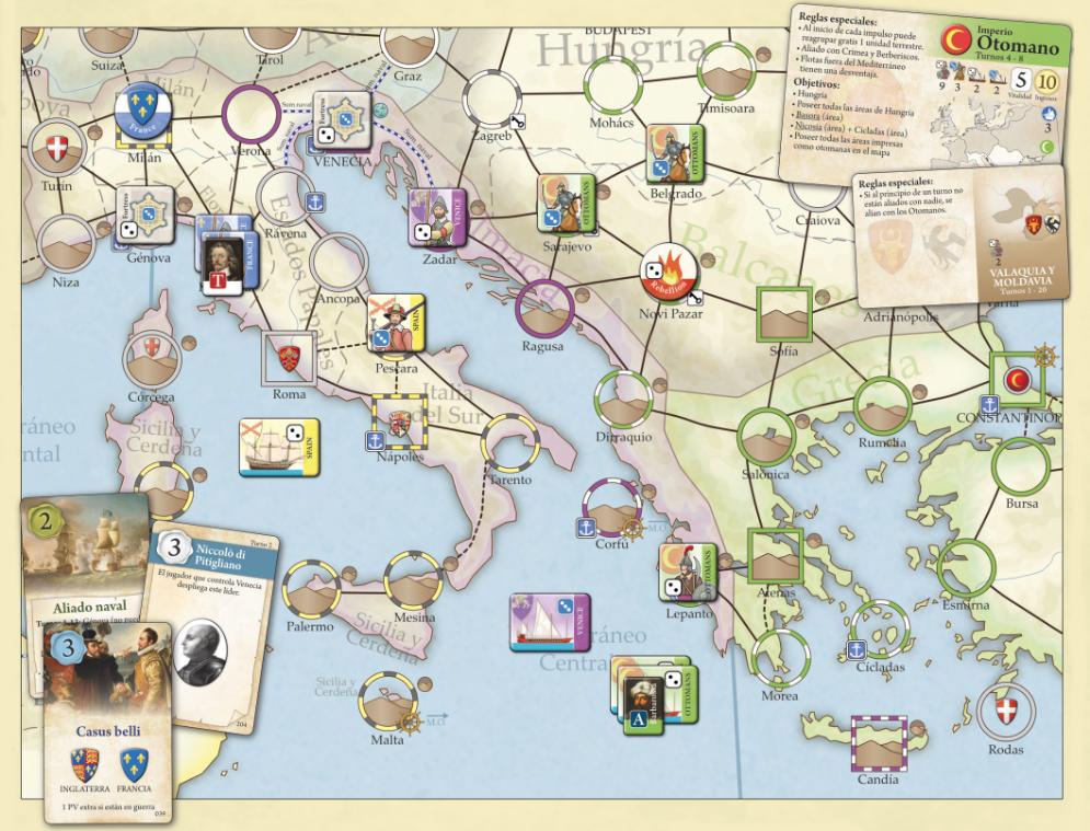 Por ejemplo, el escenario de las Guerras Italianas ha estado presente en la primera edición, en la segunda y en la actual, y lo hemos disfrutado en nuestros playtestings en todas ellas. A lo largo del tiempo hemos ido afinando reglas, escenarios y diseño gráfico, pero las ediciones anteriores siguen siendo igual de jugables y divertidas que siempre.