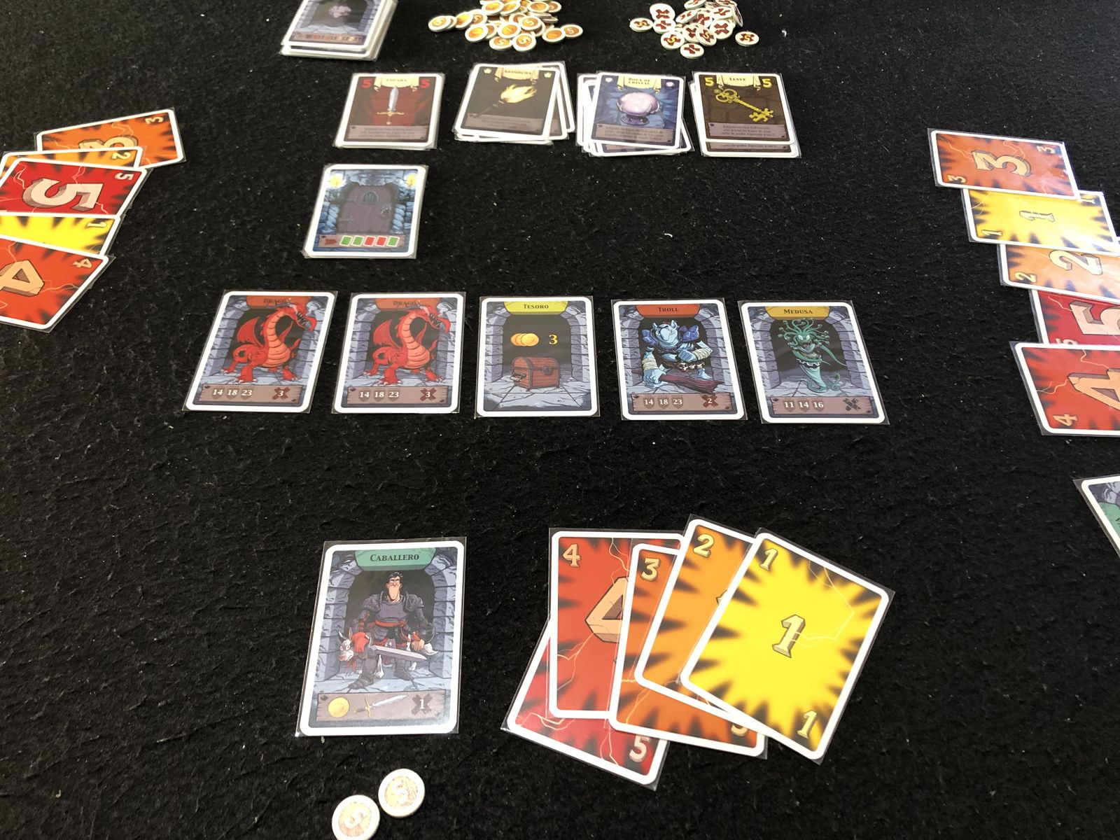 En fin, todo esto para decir que, en mi opinión, en Dungeon Raiders el dilema que ocurre es el del polizonte, en el que has de jugar tus cartas esperando que los demás tiren del carro, con la idea de reservar tus mejores cartas cuando te interese ser el ganador en algunas de las pruebas. También tienes que ir pensando qué harán los demás para no ser el que reciba el daño con los monstruos. Es un juego muy interesante, la verdad. Has de controlar no solo el dinero si no la salud también.