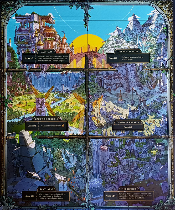 - Las Ubicaciones del mapa son menos temáticas, pero aún así el Castillo que te da votos en el Consejo y la Necrópolis que te hace recuperar cartas del descarte me parecen muy acertadas