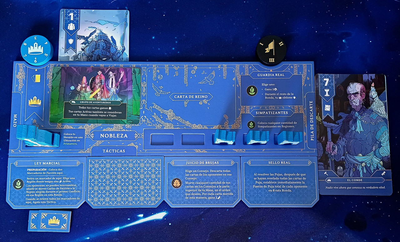- Al mandar a alguien al Consejo se queda allí para seguir contribuyendo con sus votos. De forma similar, se queda custodiando la carta de Reino por la que ha pujado, que vienen a representar objetos, sucesos, todo el trasfondo y la historia que hay en este Reino que intentamos gobernar
