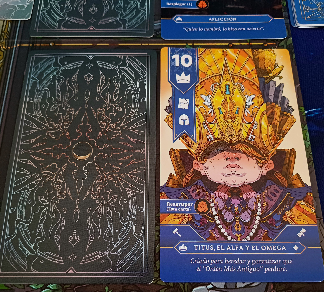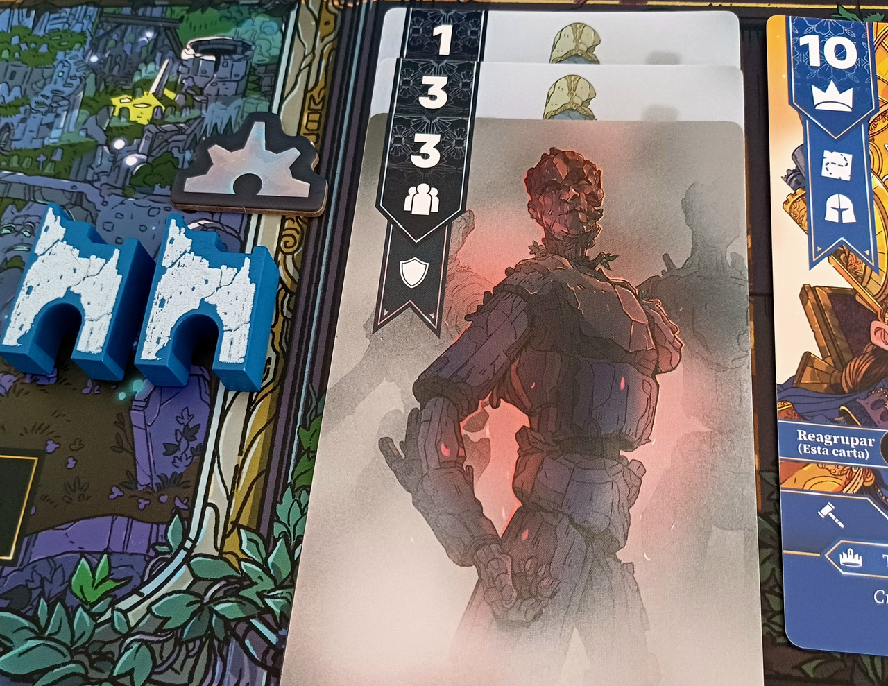 Algo interesante es que estas cartas ¡te las pueden robar!, como alternativa a tomar una carta de la oferta. Y el Simulacro también podrá hacerlo, según si esa instrucción está en la carta que dicta sus preferencias para la ronda. Así que el valor de la carta que usas para la puja, y que se queda bloqueada con el Reino que obtienes a modo de 'guardián', es importante no sólo para la puja en sí sino para que no te roben el Reino posteriormente.
