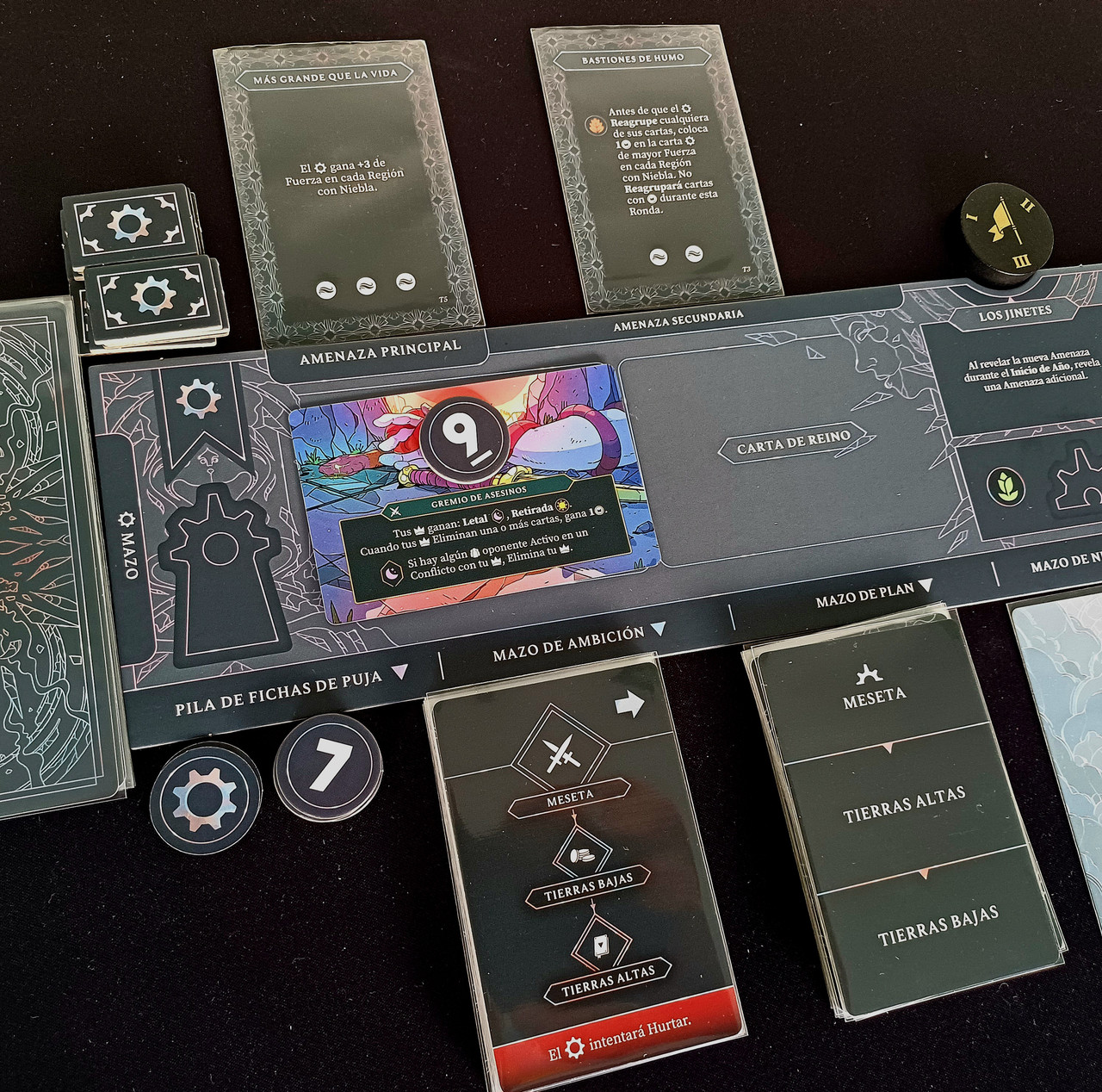 El juego tiene mucha variabilidad, por eso veo complicado que tengas control sobre la partida. Además está el resto de jugadores, que también toman sus decisiones que chocan con las tuyas. Y cuantos más jugadores más caos. Por opiniones que he visto, y por las votaciones en la bgg, su mejor n° es 3 jugadores. En solitario hay un poco menos descontrol, menos elementos chocan, pero no vas a jugar mecánicamente por mucho que conozcas tu facción. La información oculta, las cartas de Reino que aparecen para adquirir, las cartas de Niebla que le salen al bot, todo eso cambia por completo la partida y hacen que te tengas que adaptar, pese a que siempre tengas en mente las peculiaridades de tu facción e intentes explotarlas.