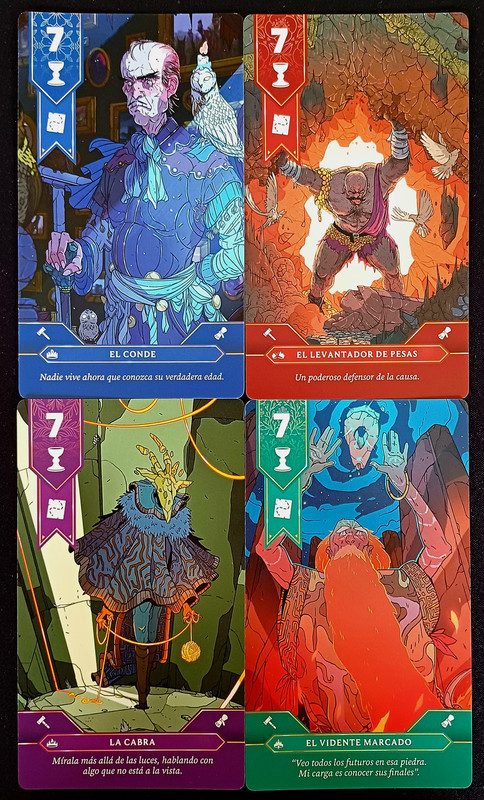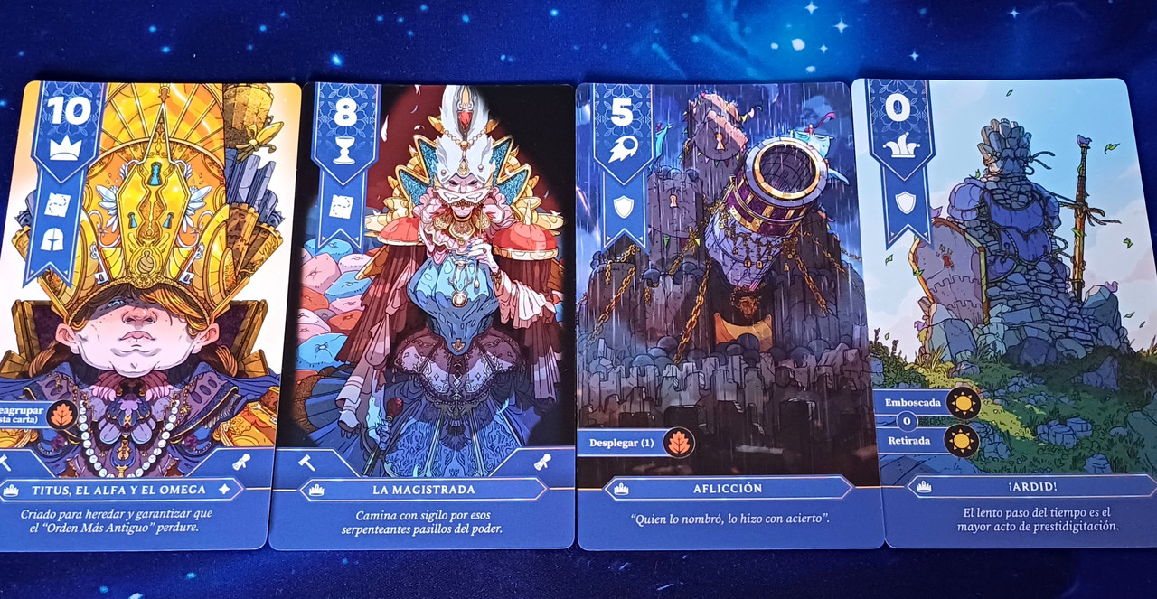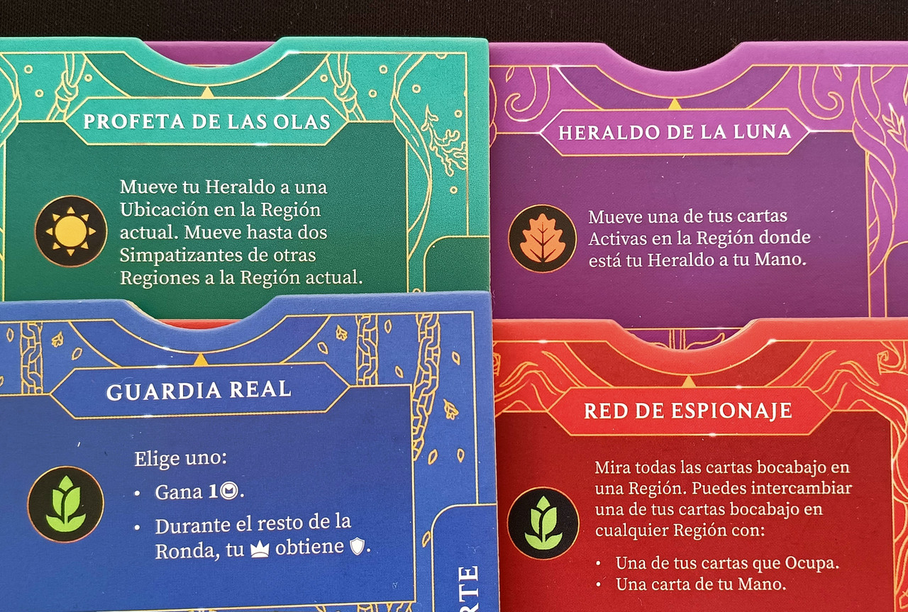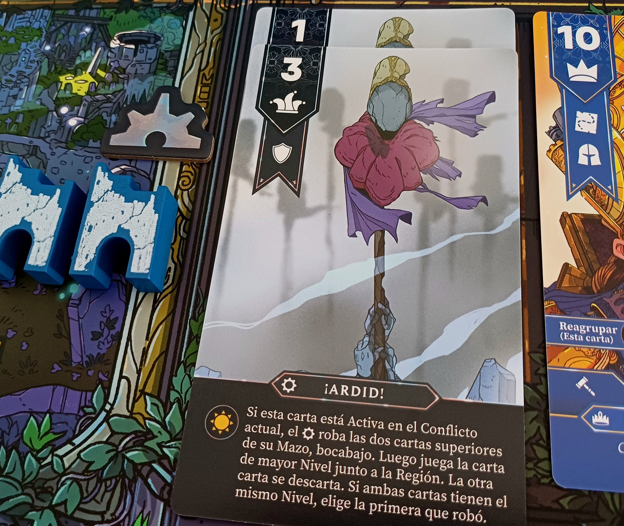 Y es que las cartas no tienen sólo un valor de fuerza y ya, ésto no es el tute; pueden tener un efecto que se resuelve al desplegarla en el conflicto. Aparte también pueden servir para el mencionado Consejo o para obtener fichas para cartas avanzadas.
