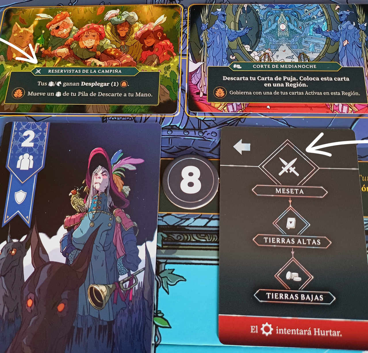 Información OcultaUna parte crucial del juego es la incertidumbre que los jugadores tienen acerca de lo que juegan los demás. En las pujas y en los conflictos las cartas se juegan boca abajo y, una vez colocadas todas, se van revelando. Si no eres el primero en orden de turno tienes la ventaja de que sabes si los anteriores jugadores han puesto Simpatizantes, pero el mayor peso del conflicto, las cartas, es desconocido. Puedes ver el descarte de los otros jugadores, y con eso y tu intuición decides qué cartas jugar y dónde.