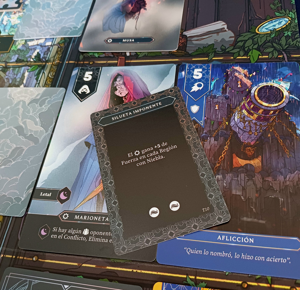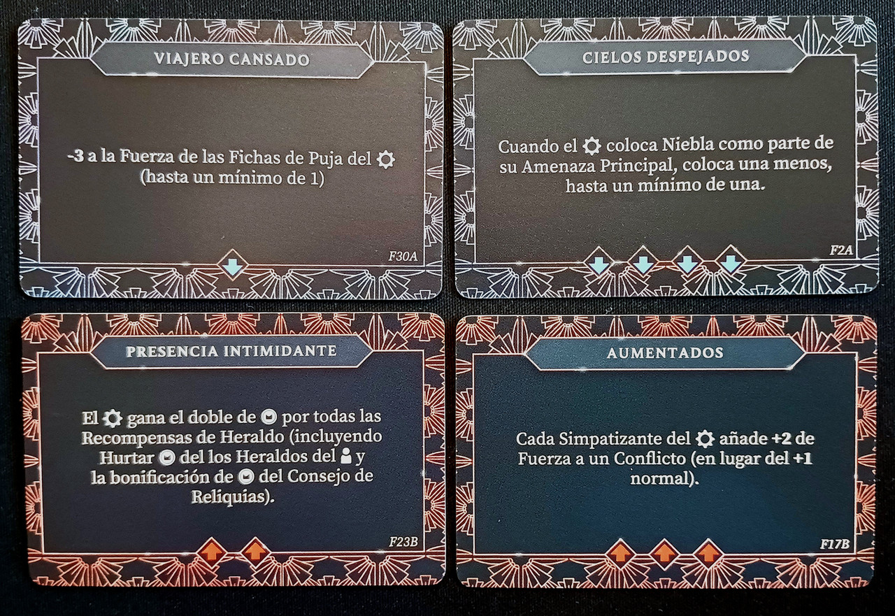 - Mazo para la colocación de Simpatizantes y cartas de Amenaza. Estas cartas de Amenaza son un añadido brutal, que compensa con efectos negativos para ti el hecho de que el bot no evalúe las opciones como lo puedes hacer tú, y quizás también las hayan introducido para compensar el uso que hacemos de los Reinos, ya que algunos son muy potentes. Se añadirá Niebla (el anverso de las cartas de Amenaza) a 1, 2 o las 3 Regiones y ahí se aplicará lo que diga la Amenaza. Y son súper puñeteros. Puede que te penalice por ganar allí, o que le dé alguna recompensa extra al Simulacro si gana, o te haga perder cartas...muchos efectos diferentes que deberás tener en cuenta a la hora de colocar las cartas, incluso para evitar ganar en cierto lugar o evitar que gane él
