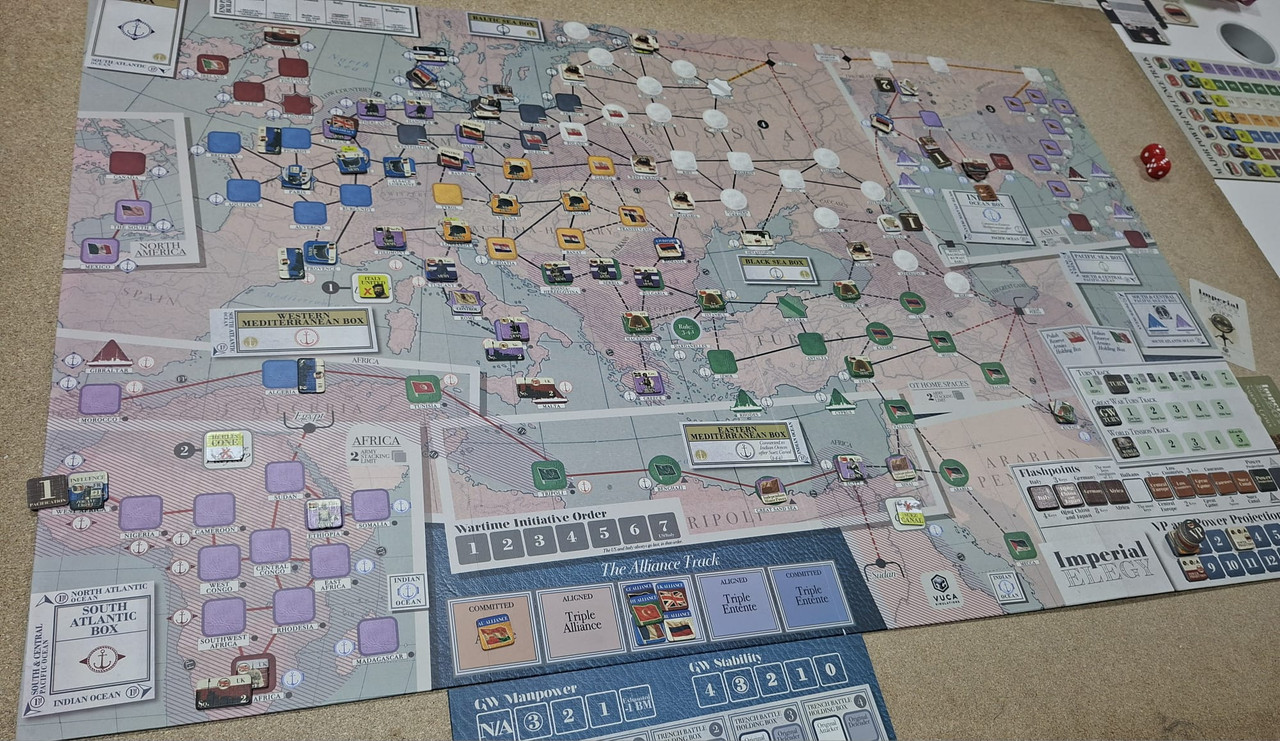 Una vez que esta se declara, se termina la parte ordinaria del juego, se saca un nuevo tablero (el juego tiene cartón para aburrir) para representar la población de los contendientes (manpower) porque esta limita el número de ejércitos que pueden construirse, y se empieza a jugar la guerra de acuerdo con el orden de iniciativa de cada jugador. En este momento, las alianzas dependerán de cómo se encuentra el track, que puede ser absolutamente antihistórico, como nos pasó a nosotros en nuestra primera partida, donde Alemania y el Imperio Otomano formaban parte de la Triple Alianza, luchando contra Rusia, Francia y Austro-Hungría, que formaba la Triple Entente, con Reino Unido de neutral. La neutralidad una vez iniciada la Gran Guerra impide que te atacan pero tu tampoco puedes hacerlo.