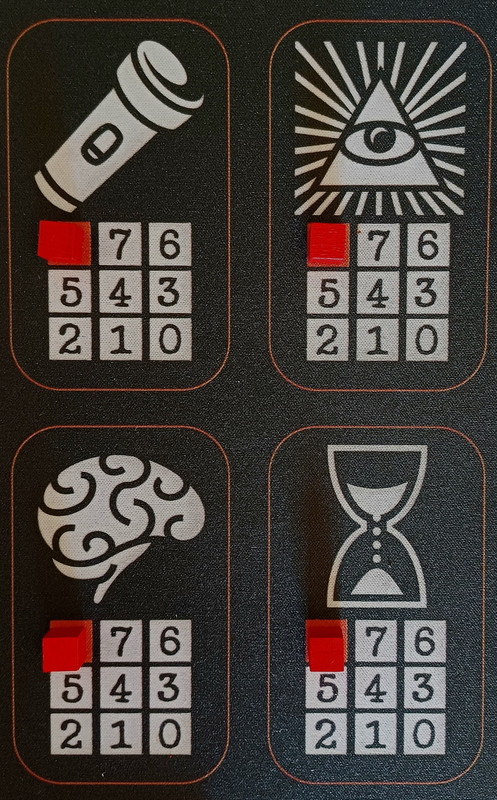 • Habría estado bien añadir o bien un contador de rondas, o algún tipo de desencadenante de final de partida o algo que aumentase la presión. La locura, que determina la derrota, tiende a bajar, es cierto, pero no de forma constante. Agradezco que sea así y que no vaya siempre bajando, pero puede ocurrir que se mantenga alta ya avanzada la partida (depende de los eventos y las cartas de resolución que te hayan salido). Es como que no hay una progresión en la tensión durante la partida; puede suceder que baje mucho, y lo esperable es que así suceda, ya que te vas quedando sin linterna, la cordura va bajando, después la concentración...pero no ocurre siempre. Es parte del juego, unas veces se da mejor que otras, la suerte te acompaña y vas más holgado