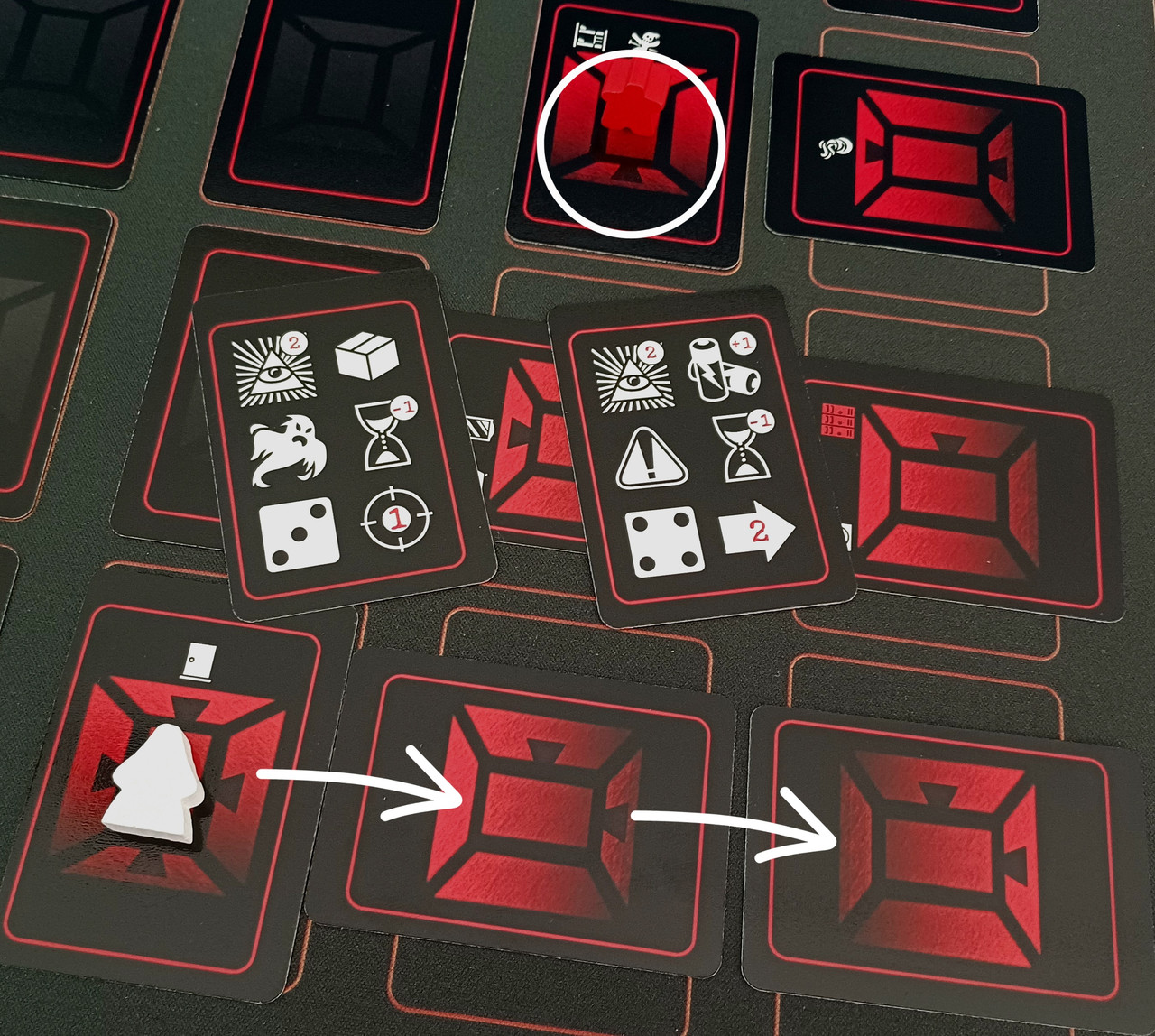 Con la primera carta, el fantasma se movería 1 espacio hacia nuestra posición (punto de mira), es decir, 1 hacia la derecha. Con la segunda carta se movería 2 espacios a la derecha