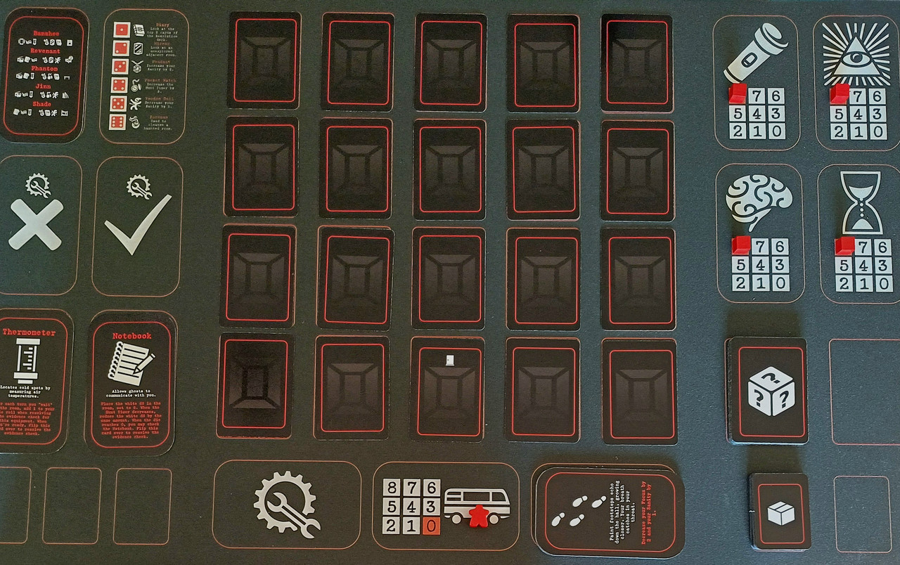 Puede hacerse repetitivo, ya que al fin y al cabo estás haciendo pocas cosas y de forma continuada. No me supone un problema primero porque la duración de la partida no da como para hacerse largo o pesado. Y segundo porque, aún dentro de su sencillez, las etapas que hay en la partida de: 1) uso del equipo, 2) recoger amuletos y ritual, junto a la propia exploración de la casa, dan sensación de progresión. Y las apariciones del fantasma rompen un poco la repetitividad de los turnos.