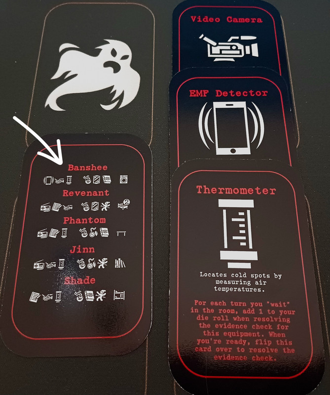 Así que el desarrollo del juego es explorar la casa hasta que das con una habitación en la que se usa un equipo que llevas encima. Lo usas y, si la tirada tiene éxito, te quedarán dos equipos más antes de poder exorcizar la casa. Si fallas no pasa nada, sólo que no avanzas en la partida.