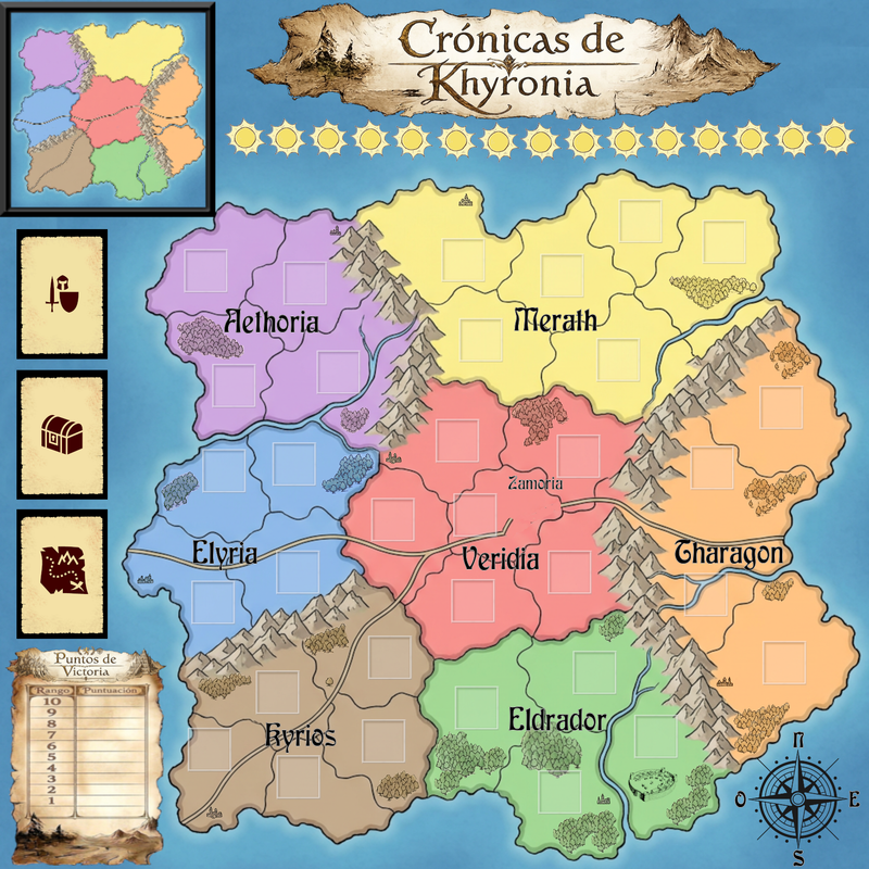 Mapa de Reinos (Área Principal): El tablero está dividido en siete condados o regiones principales, cada una con un color distintivo: Aethoria (morado), Nerath (amarillo), Veridia (rojo - zona central con la cuidad más importante del continente, Zamoria), Eldrador (verde), Tharagon (naranja), Kyrios (marrón) y Elyria (azul).