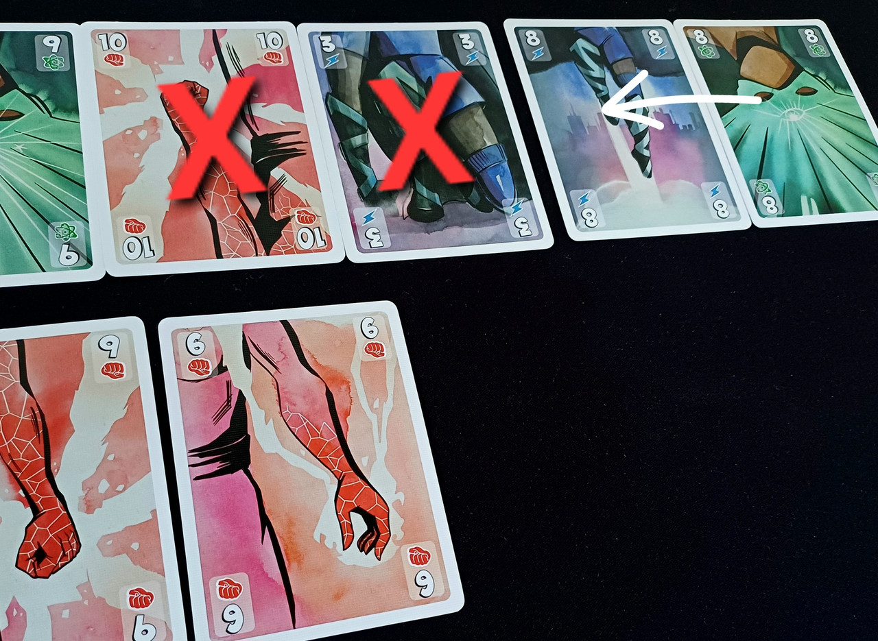 Saca 8 azul y 8 verde. Ya tiene alguna carta de ambos palos así que mantiene las dos cartas, que sustituyen al 10 rojo y el 3 azul, siendo éstas descartadas
