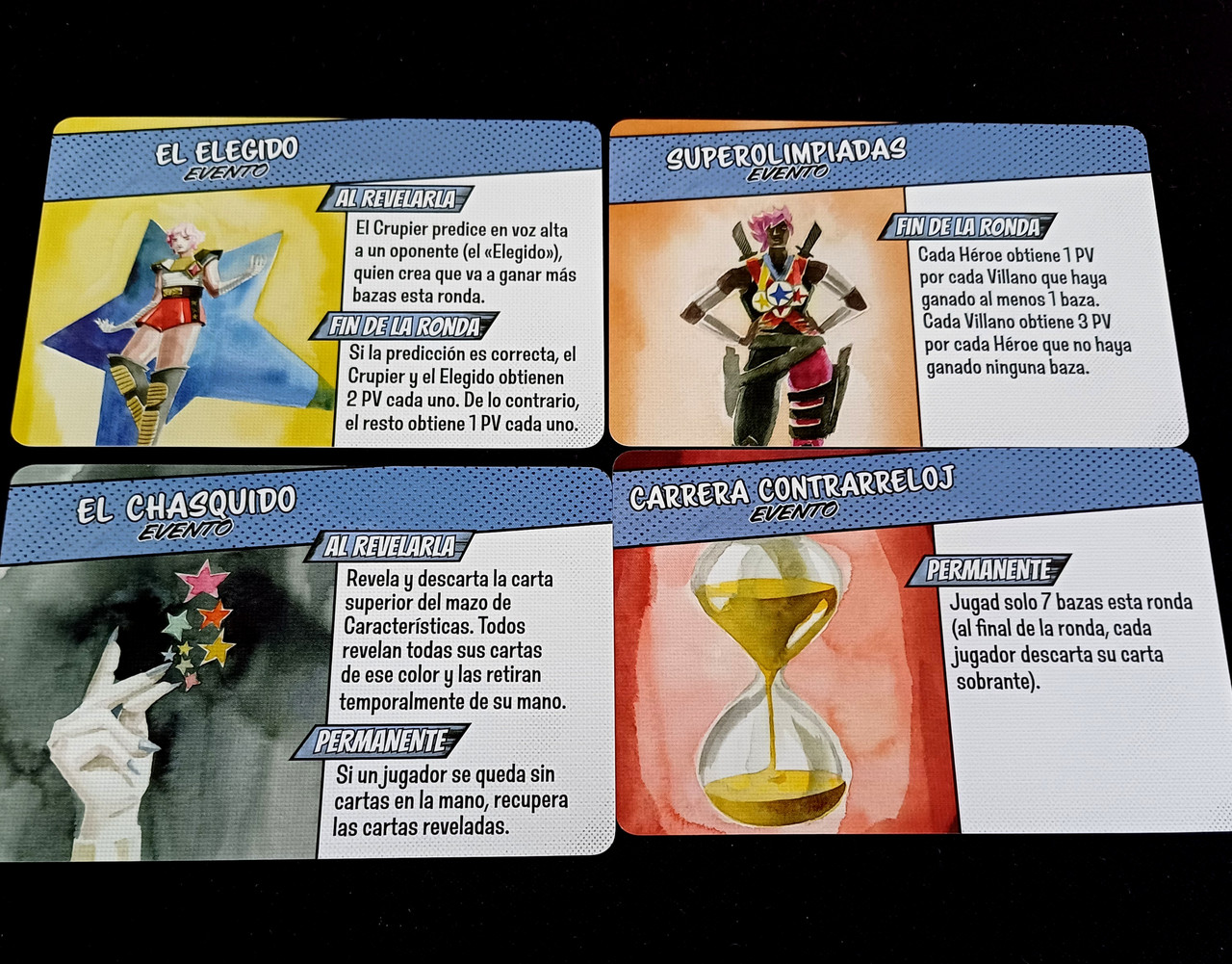 • En el juego hay un mazo de Eventos y se juega uno cada ronda. Junto a las habilidades son lo que le da vidilla al juego ya que modifican su funcionamiento básico de bazas. Por ejemplo, cambiar cartas con los otros jugadores o modificar el palo dominante: