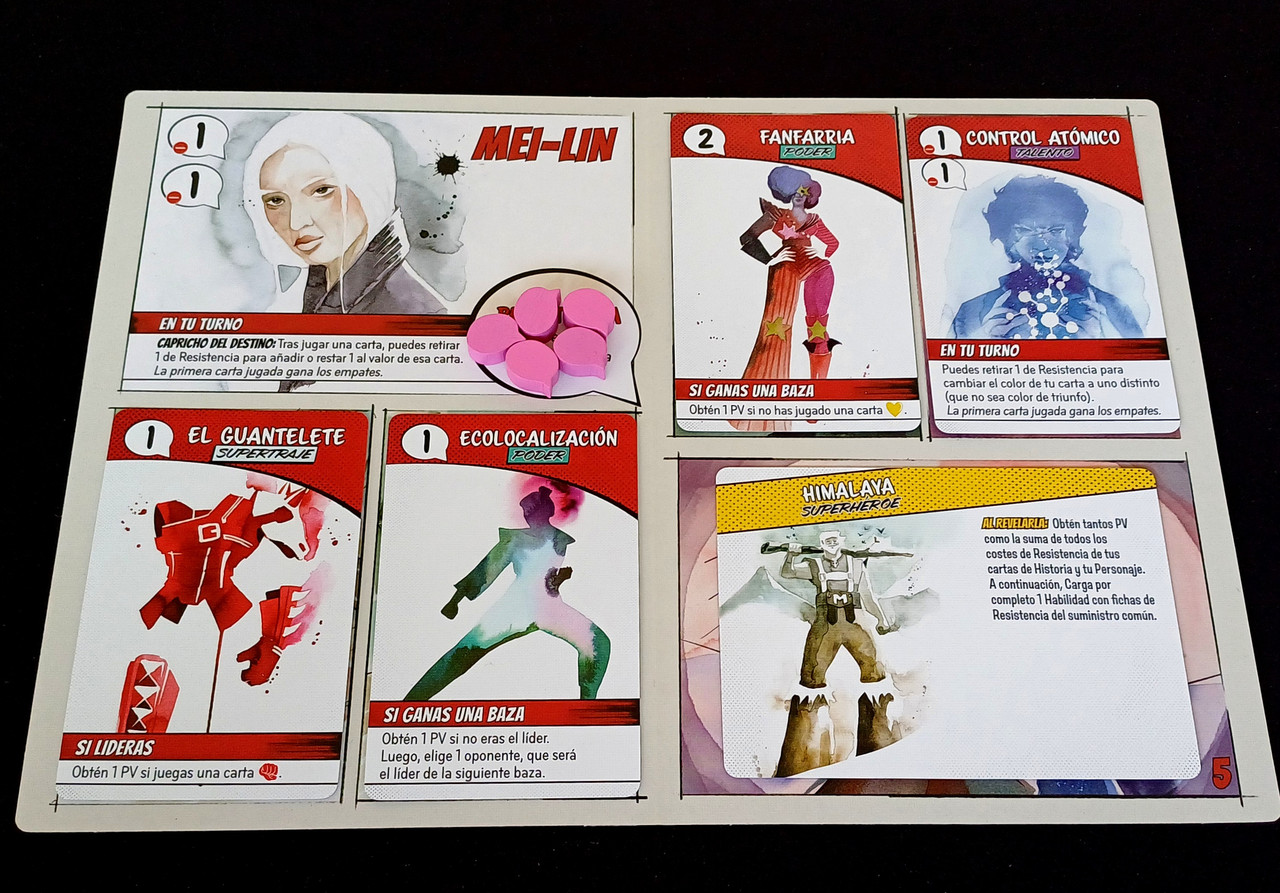 • Aparte de enmarcarlo en un tema atractivo como es el de héroes/villanos y los superpoderes, lo hace con una interesante mecánica de Añadido progresivo de Superpoderes, que van 'creando la historia' de tu personaje (coged ésto con pinzas, son habilidades y ya). En cada ronda tu personaje va a incorporar a su tablero una carta de Superpoder, que podrás activar con unas fichas.