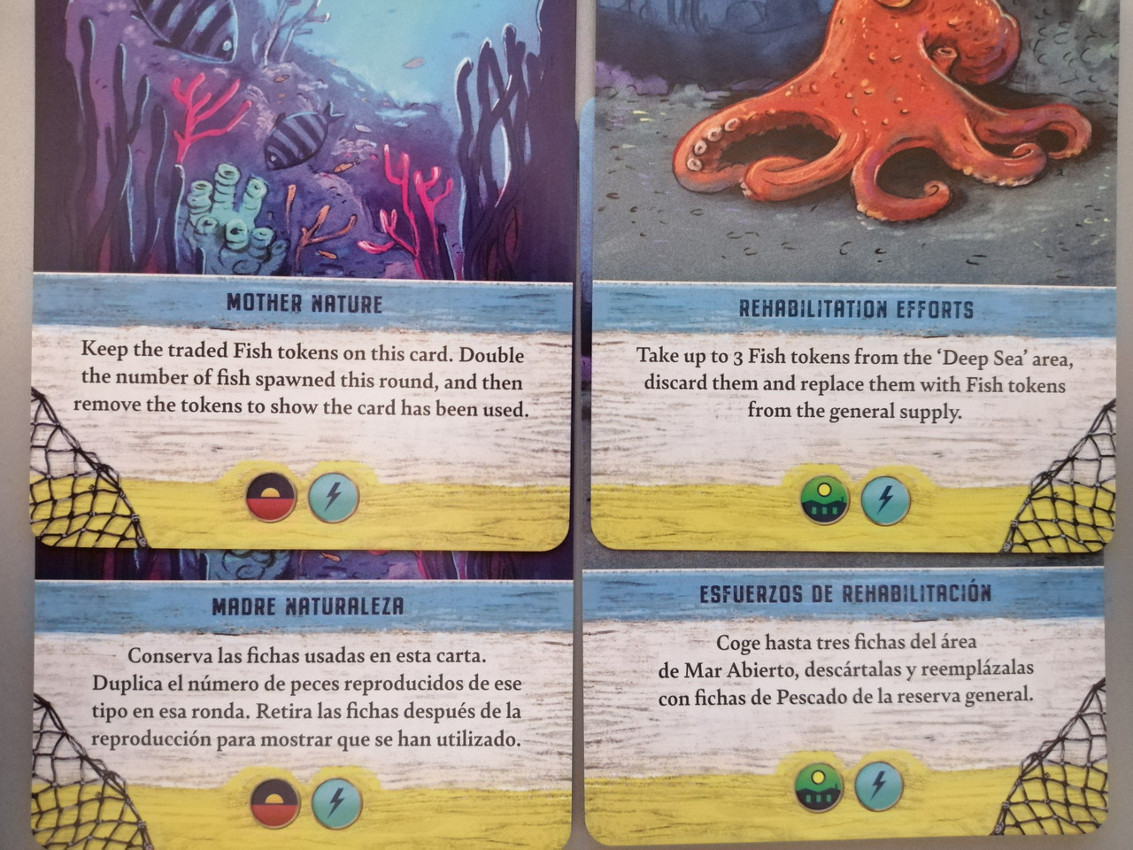 Madre Naturaleza. En español exige que la bonificación de la carta se use solo para los tipos de peces que se usaron para adquirir la carta. Teniendo en cuenta que la carta es de uso inmediato y acabas de quitar 2 peces de dicho tipo, su utilidad queda muy mermada. Aún así, podría ser que la errata estuviera en la carta inglesa y realmente se quisiera delimitar enormemente su uso. Sea lo que sea, hay una errata.